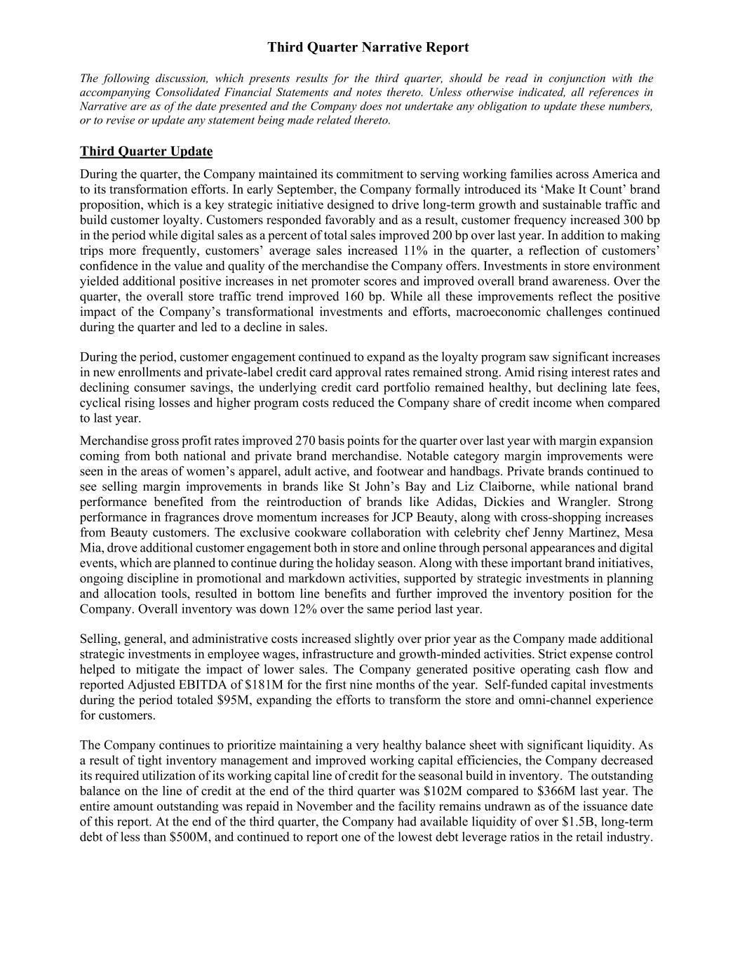 Third Quarter Narrative Report The following discussion, which presents results for the third quarter, should be read in conjunction with the accompanying Consolidated Financial Statements and notes thereto. Unless otherwise indicated, all references in Narrative are as of the date presented and the Company does not undertake any obligation to update these numbers, or to revise or update any statement being made related thereto. Third Quarter Update During the quarter, the Company maintained its commitment to serving working families across America and to its transformation efforts. In early September, the Company formally introduced its ‘Make It Count’ brand proposition, which is a key strategic initiative designed to drive long-term growth and sustainable traffic and build customer loyalty. Customers responded favorably and as a result, customer frequency increased 300 bp in the period while digital sales as a percent of total sales improved 200 bp over last year. In addition to making trips more frequently, customers’ average sales increased 11% in the quarter, a reflection of customers’ confidence in the value and quality of the merchandise the Company offers. Investments in store environment yielded additional positive increases in net promoter scores and improved overall brand awareness. Over the quarter, the overall store traffic trend improved 160 bp. While all these improvements reflect the positive impact of the Company’s transformational investments and efforts, macroeconomic challenges continued during the quarter and led to a decline in sales. During the period, customer engagement continued to expand as the loyalty program saw significant increases in new enrollments and private-label credit card approval rates remained strong. Amid rising interest rates and declining consumer savings, the underlying credit card portfolio remained healthy, but declining late fees, cyclical rising losses and higher program costs reduced the Company share of credit income when compared to last year. Merchandise gross profit rates improved 270 basis points for the quarter over last year with margin expansion coming from both national and private brand merchandise. Notable category margin improvements were seen in the areas of women’s apparel, adult active, and footwear and handbags. Private brands continued to see selling margin improvements in brands like St John’s Bay and Liz Claiborne, while national brand performance benefited from the reintroduction of brands like Adidas, Dickies and Wrangler. Strong performance in fragrances drove momentum increases for JCP Beauty, along with cross-shopping increases from Beauty customers. The exclusive cookware collaboration with celebrity chef Jenny Martinez, Mesa Mia, drove additional customer engagement both in store and online through personal appearances and digital events, which are planned to continue during the holiday season. Along with these important brand initiatives, ongoing discipline in promotional and markdown activities, supported by strategic investments in planning and allocation tools, resulted in bottom line benefits and further improved the inventory position for the Company. Overall inventory was down 12% over the same period last year. Selling, general, and administrative costs increased slightly over prior year as the Company made additional strategic investments in employee wages, infrastructure and growth-minded activities. Strict expense control helped to mitigate the impact of lower sales. The Company generated positive operating cash flow and reported Adjusted EBITDA of $181M for the first nine months of the year. Self-funded capital investments during the period totaled $95M, expanding the efforts to transform the store and omni-channel experience for customers. The Company continues to prioritize maintaining a very healthy balance sheet with significant liquidity. As a result of tight inventory management and improved working capital efficiencies, the Company decreased its required utilization of its working capital line of credit for the seasonal build in inventory. The outstanding balance on the line of credit at the end of the third quarter was $102M compared to $366M last year. The entire amount outstanding was repaid in November and the facility remains undrawn as of the issuance date of this report. At the end of the third quarter, the Company had available liquidity of over $1.5B, long-term debt of less than $500M, and continued to report one of the lowest debt leverage ratios in the retail industry.