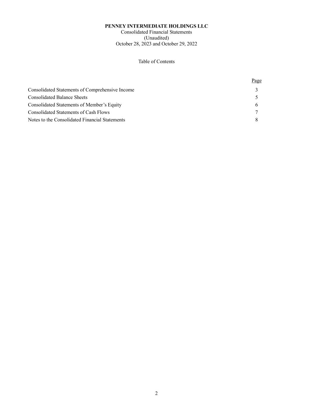 2 PENNEY INTERMEDIATE HOLDINGS LLC Consolidated Financial Statements (Unaudited) October 28, 2023 and October 29, 2022 Table of Contents Page Consolidated Statements of Comprehensive Income 3 Consolidated Balance Sheets 5 Consolidated Statements of Member’s Equity 6 Consolidated Statements of Cash Flows 7 Notes to the Consolidated Financial Statements 8