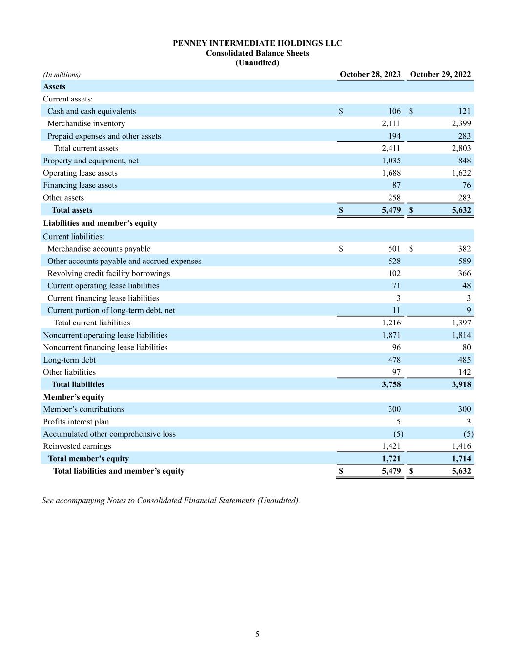 5 PENNEY INTERMEDIATE HOLDINGS LLC Consolidated Balance Sheets (Unaudited) (In millions) October 28, 2023 October 29, 2022 Assets Current assets: Cash and cash equivalents $ 106 $ 121 Merchandise inventory 2,111 2,399 Prepaid expenses and other assets 194 283 Total current assets 2,411 2,803 Property and equipment, net 1,035 848 Operating lease assets 1,688 1,622 Financing lease assets 87 76 Other assets 258 283 Total assets $ 5,479 $ 5,632 Liabilities and member’s equity Current liabilities: Merchandise accounts payable $ 501 $ 382 Other accounts payable and accrued expenses 528 589 Revolving credit facility borrowings 102 366 Current operating lease liabilities 71 48 Current financing lease liabilities 3 3 Current portion of long-term debt, net 11 9 Total current liabilities 1,216 1,397 Noncurrent operating lease liabilities 1,871 1,814 Noncurrent financing lease liabilities 96 80 Long-term debt 478 485 Other liabilities 97 142 Total liabilities 3,758 3,918 Member’s equity Member’s contributions 300 300 Profits interest plan 5 3 Accumulated other comprehensive loss (5) (5) Reinvested earnings 1,421 1,416 Total member’s equity 1,721 1,714 Total liabilities and member’s equity $ 5,479 $ 5,632 See accompanying Notes to Consolidated Financial Statements (Unaudited).