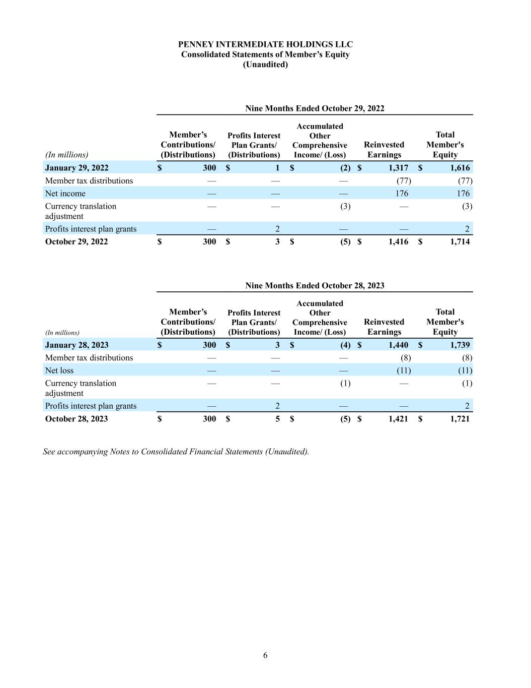 6 PENNEY INTERMEDIATE HOLDINGS LLC Consolidated Statements of Member’s Equity (Unaudited) Nine Months Ended October 29, 2022 (In millions) Member’s Contributions/ (Distributions) Profits Interest Plan Grants/ (Distributions) Accumulated Other Comprehensive Income/ (Loss) Reinvested Earnings Total Member's Equity January 29, 2022 $ 300 $ 1 $ (2) $ 1,317 $ 1,616 Member tax distributions — — — (77) (77) Net income — — — 176 176 Currency translation adjustment — — (3) — (3) Profits interest plan grants — 2 — — 2 October 29, 2022 $ 300 $ 3 $ (5) $ 1,416 $ 1,714 Nine Months Ended October 28, 2023 (In millions) Member’s Contributions/ (Distributions) Profits Interest Plan Grants/ (Distributions) Accumulated Other Comprehensive Income/ (Loss) Reinvested Earnings Total Member's Equity January 28, 2023 $ 300 $ 3 $ (4) $ 1,440 $ 1,739 Member tax distributions — — — (8) (8) Net loss — — — (11) (11) Currency translation adjustment — — (1) — (1) Profits interest plan grants — 2 — — 2 October 28, 2023 $ 300 $ 5 $ (5) $ 1,421 $ 1,721 See accompanying Notes to Consolidated Financial Statements (Unaudited).