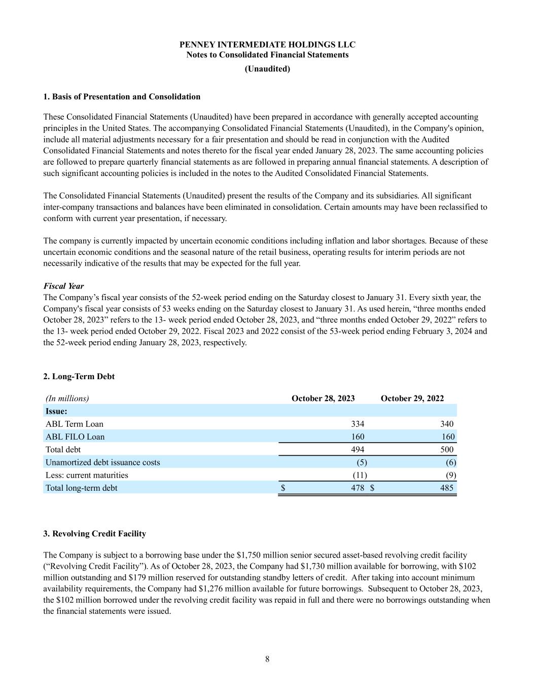8 PENNEY INTERMEDIATE HOLDINGS LLC Notes to Consolidated Financial Statements (Unaudited) 1. Basis of Presentation and Consolidation These Consolidated Financial Statements (Unaudited) have been prepared in accordance with generally accepted accounting principles in the United States. The accompanying Consolidated Financial Statements (Unaudited), in the Company's opinion, include all material adjustments necessary for a fair presentation and should be read in conjunction with the Audited Consolidated Financial Statements and notes thereto for the fiscal year ended January 28, 2023. The same accounting policies are followed to prepare quarterly financial statements as are followed in preparing annual financial statements. A description of such significant accounting policies is included in the notes to the Audited Consolidated Financial Statements. The Consolidated Financial Statements (Unaudited) present the results of the Company and its subsidiaries. All significant inter-company transactions and balances have been eliminated in consolidation. Certain amounts may have been reclassified to conform with current year presentation, if necessary. The company is currently impacted by uncertain economic conditions including inflation and labor shortages. Because of these uncertain economic conditions and the seasonal nature of the retail business, operating results for interim periods are not necessarily indicative of the results that may be expected for the full year. Fiscal Year The Company’s fiscal year consists of the 52-week period ending on the Saturday closest to January 31. Every sixth year, the Company's fiscal year consists of 53 weeks ending on the Saturday closest to January 31. As used herein, “three months ended October 28, 2023” refers to the 13- week period ended October 28, 2023, and “three months ended October 29, 2022” refers to the 13- week period ended October 29, 2022. Fiscal 2023 and 2022 consist of the 53-week period ending February 3, 2024 and the 52-week period ending January 28, 2023, respectively. 2. Long-Term Debt (In millions) October 28, 2023 October 29, 2022 Issue: ABL Term Loan 334 340 ABL FILO Loan 160 160 Total debt 494 500 Unamortized debt issuance costs (5) (6) Less: current maturities (11) (9) Total long-term debt $ 478 $ 485 3. Revolving Credit Facility The Company is subject to a borrowing base under the $1,750 million senior secured asset-based revolving credit facility (“Revolving Credit Facility”). As of October 28, 2023, the Company had $1,730 million available for borrowing, with $102 million outstanding and $179 million reserved for outstanding standby letters of credit. After taking into account minimum availability requirements, the Company had $1,276 million available for future borrowings. Subsequent to October 28, 2023, the $102 million borrowed under the revolving credit facility was repaid in full and there were no borrowings outstanding when the financial statements were issued.
