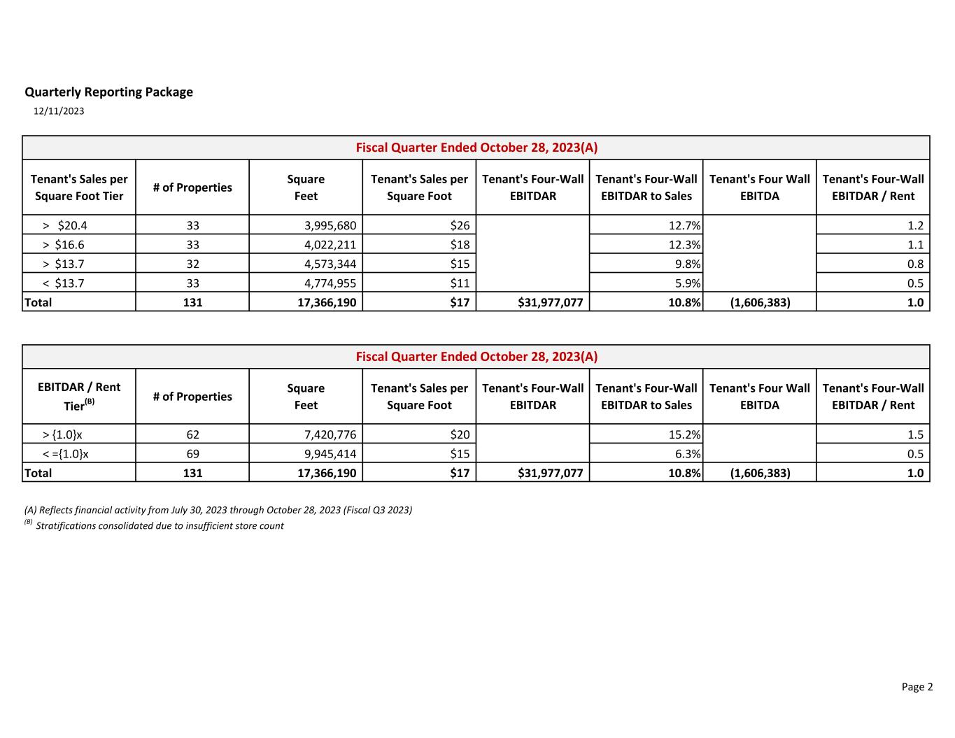 Quarterly Reporting Package 12/11/2023 Property Ownership # of Properties Square Feet Tenant's Sales per Square Foot Tenant's Four-Wall EBITDAR Rent Tenant's Four Wall EBITDA Tenant's Four-Wall EBITDAR / Rent Fee 110 14,401,504 $16 $25,279,120 $26,551,212 ($1,272,092) 1.0 Ground Lease 21 2,964,686 $21 $6,697,957 $7,032,249 ($334,292) 1.0 Total 131 17,366,190 $17 $31,977,077 $33,583,460 ($1,606,383) 1.0 Rent Tier (B) # of Properties Square Feet 1 > $ 2.3 33 4,177,071 2 > $ 1.8 33 4,607,409 3 > $ 1.6 32 4,077,330 4 < $ 1.6 33 4,504,380 Total 131 17,366,190 (A) Reflects financial activity from July 30, 2023 through October 28, 2023 (Fiscal Q3 2023) (B) Rent tier determined based on book Occupancy Expense per square foot Rent : includes book Rent, Ground Leases, Contingent Rent, CAM & accrued Real Estate Taxes EBITDA : Tenant's Unallocated Store Contribution Profit, uses book rent EBITDAR : excludes Occupancy included in calculation of EBITDA Fiscal Quarter Ended October 28, 2023(A) Fiscal Quarter Ended October 28, 2023(A) Page 1