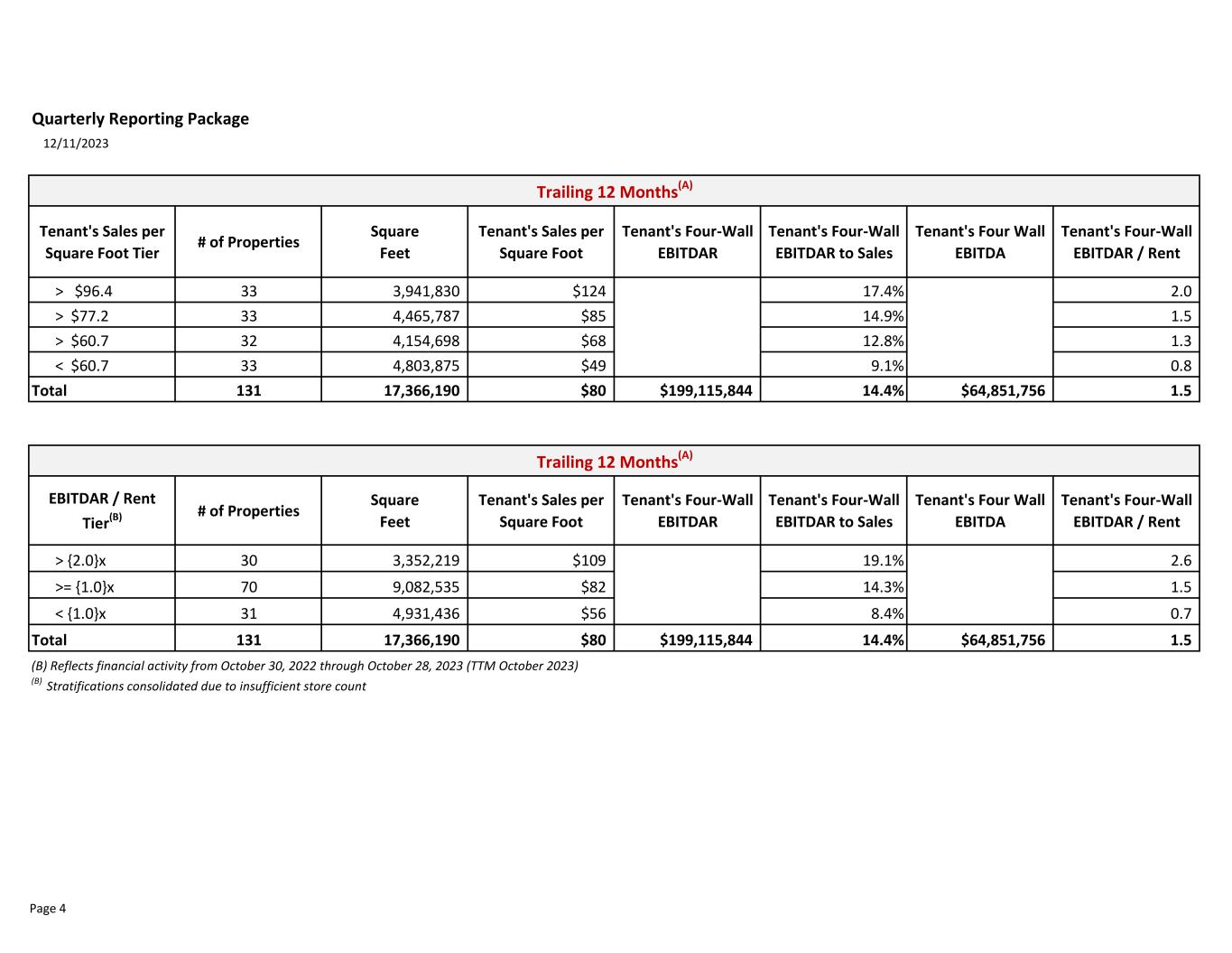 Quarterly Reporting Package 12/11/2023 Property Ownership # of Properties Square Feet Tenant's Sales per Square Foot Tenant's Four-Wall EBITDAR Rent Tenant's Four Wall EBITDA Tenant's Four-Wall EBITDAR / Rent Fee 110 14,401,504 $76 $153,433,429 $105,820,193 $47,613,236 1.4 Ground Lease 21 2,964,686 $98 $45,682,415 $28,443,895 $17,238,520 1.6 Total 131 17,366,190 $80 $199,115,844 $134,264,088 $64,851,756 1.5 Rent Tier (A) # of Properties Square Feet Tenant's Sales per Square Foot Tenant's Four-Wall EBITDAR Rent Tenant's Four Wall EBITDA Tenant's Four-Wall EBITDAR / Rent 1 > $ 9.2 33 4,128,156 $112 $77,225,500 $46,862,731 1.6 2 > $ 7.4 33 4,425,682 $80 $53,537,113 $36,423,787 1.5 3 > $ 6.5 32 4,412,884 $77 $44,534,545 $30,680,853 1.5 4 < $ 6.5 33 4,399,468 $52 $23,818,686 $20,296,717 1.2 Total 131 17,366,190 $80 $199,115,844 $134,264,088 $64,851,756 1.5 (A) Rent tier determined based on book Occupancy Expense per square foot (B) Reflects financial activity from October 30, 2022 through October 28, 2023 (TTM October 2023) Rent : includes book Rent, Ground Leases, Contingent Rent, CAM & accrued Real Estate Taxes EBITDA : Tenant's Unallocated Store Contribution Profit, uses book rent EBITDAR : excludes Occupancy included in calculation of EBITDA Trailing 12 Months(B) Trailing 12 Months(B) Page 3
