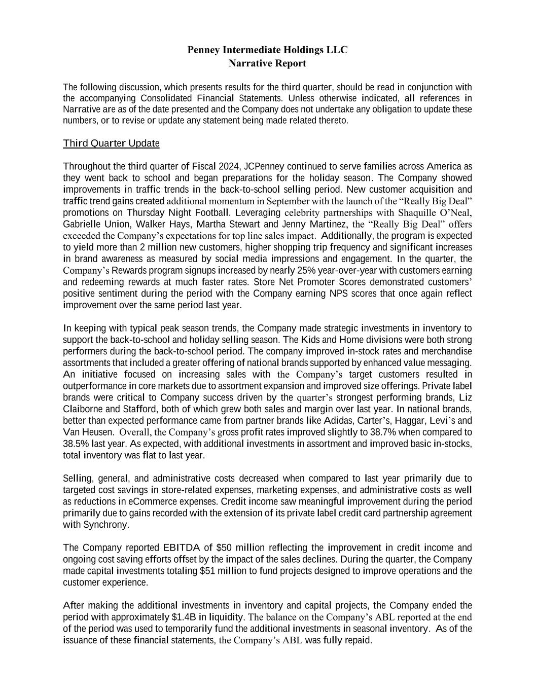 Penney Intermediate Holdings LLC Narrative Report The following discussion, which presents results for the third quarter, should be read in conjunction with the accompanying Consolidated Financial Statements. Unless otherwise indicated, all references in Narrative are as of the date presented and the Company does not undertake any obligation to update these numbers, or to revise or update any statement being made related thereto. Third Quarter Update Throughout the third quarter of Fiscal 2024, JCPenney continued to serve families across America as they went back to school and began preparations for the holiday season. The Company showed improvements in traffic trends in the back-to-school selling period. New customer acquisition and traffic trend gains created additional momentum in September with the launch of the “Really Big Deal” promotions on Thursday Night Football. Leveraging celebrity partnerships with Shaquille O’Neal, Gabrielle Union, Walker Hays, Martha Stewart and Jenny Martinez, the “Really Big Deal” offers exceeded the Company’s expectations for top line sales impact. Additionally, the program is expected to yield more than 2 million new customers, higher shopping trip frequency and significant increases in brand awareness as measured by social media impressions and engagement. In the quarter, the Company’s Rewards program signups increased by nearly 25% year-over-year with customers earning and redeeming rewards at much faster rates. Store Net Promoter Scores demonstrated customers’ positive sentiment during the period with the Company earning NPS scores that once again reflect improvement over the same period last year. In keeping with typical peak season trends, the Company made strategic investments in inventory to support the back-to-school and holiday selling season. The Kids and Home divisions were both strong performers during the back-to-school period. The company improved in-stock rates and merchandise assortments that included a greater offering of national brands supported by enhanced value messaging. An initiative focused on increasing sales with the Company’s target customers resulted in outperformance in core markets due to assortment expansion and improved size offerings. Private label brands were critical to Company success driven by the quarter’s strongest performing brands, Liz Claiborne and Stafford, both of which grew both sales and margin over last year. In national brands, better than expected performance came from partner brands like Adidas, Carter’s, Haggar, Levi’s and Van Heusen. Overall, the Company’s gross profit rates improved slightly to 38.7% when compared to 38.5% last year. As expected, with additional investments in assortment and improved basic in-stocks, total inventory was flat to last year. Selling, general, and administrative costs decreased when compared to last year primarily due to targeted cost savings in store-related expenses, marketing expenses, and administrative costs as well as reductions in eCommerce expenses. Credit income saw meaningful improvement during the period primarily due to gains recorded with the extension of its private label credit card partnership agreement with Synchrony. The Company reported EBITDA of $50 million reflecting the improvement in credit income and ongoing cost saving efforts offset by the impact of the sales declines. During the quarter, the Company made capital investments totaling $51 million to fund projects designed to improve operations and the customer experience. After making the additional investments in inventory and capital projects, the Company ended the period with approximately $1.4B in liquidity. The balance on the Company’s ABL reported at the end of the period was used to temporarily fund the additional investments in seasonal inventory. As of the issuance of these financial statements, the Company’s ABL was fully repaid.