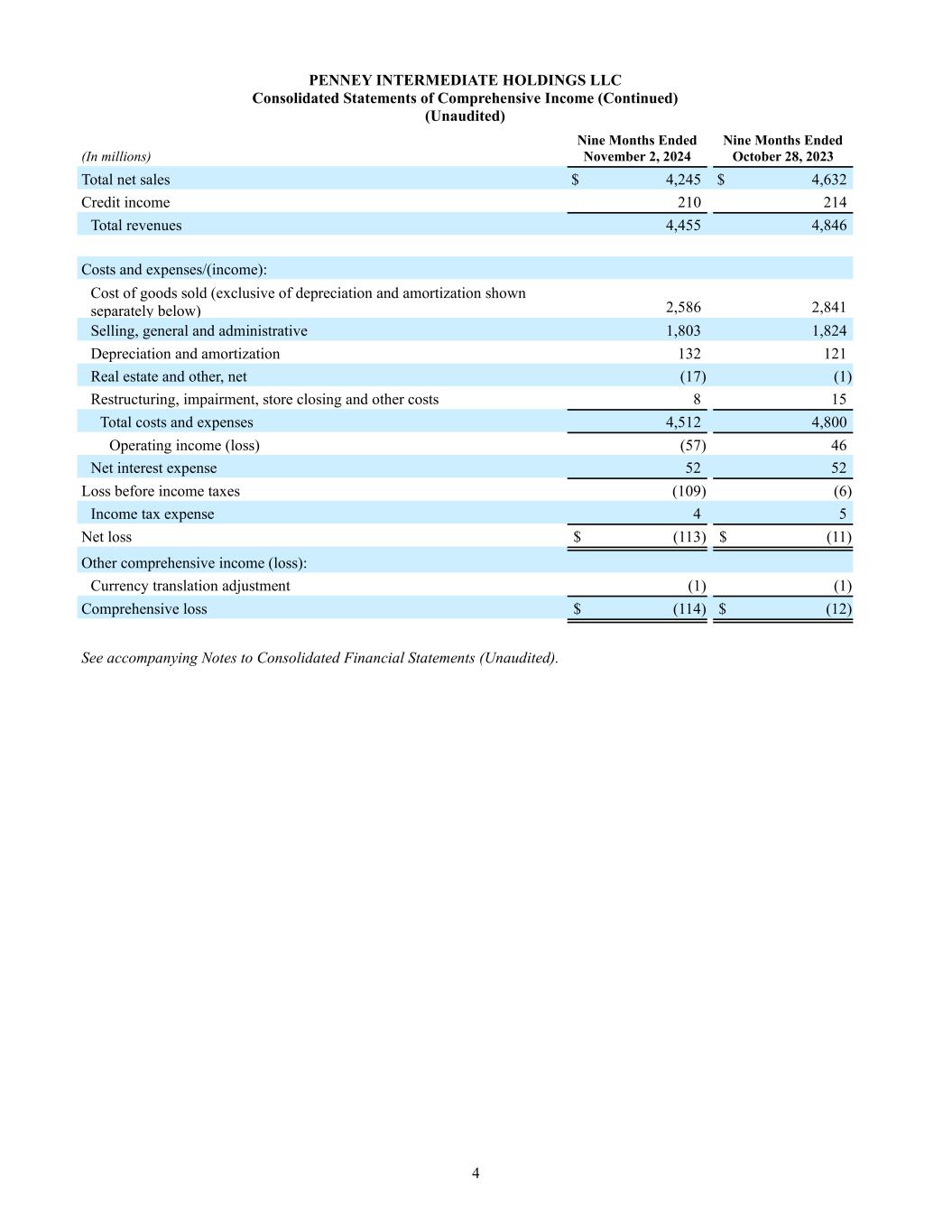 3 PENNEY INTERMEDIATE HOLDINGS LLC Consolidated Statements of Comprehensive Income (Unaudited) (In millions) Three Months Ended November 2, 2024 Three Months Ended October 28, 2023 Total net sales $ 1,410 $ 1,533 Credit income 93 70 Total revenues 1,503 1,603 Costs and expenses/(income): Cost of goods sold (exclusive of depreciation and amortization shown separately below) 865 943 Selling, general and administrative 601 626 Depreciation and amortization 47 43 Real estate and other, net (17) — Restructuring, impairment, store closing and other costs 5 1 Total costs and expenses 1,501 1,613 Operating income (loss) 2 (10) Net interest expense 17 18 Loss before income taxes (15) (28) Income tax expense 2 2 Net loss $ (17) $ (30) Other comprehensive income (loss): Currency translation adjustment — — Comprehensive loss $ (17) $ (30) See accompanying Notes to Consolidated Financial Statements (Unaudited).
