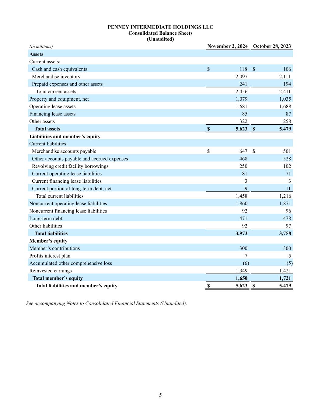 5 PENNEY INTERMEDIATE HOLDINGS LLC Consolidated Balance Sheets (Unaudited) (In millions) November 2, 2024 October 28, 2023 Assets Current assets: Cash and cash equivalents $ 118 $ 106 Merchandise inventory 2,097 2,111 Prepaid expenses and other assets 241 194 Total current assets 2,456 2,411 Property and equipment, net 1,079 1,035 Operating lease assets 1,681 1,688 Financing lease assets 85 87 Other assets 322 258 Total assets $ 5,623 $ 5,479 Liabilities and member’s equity Current liabilities: Merchandise accounts payable $ 647 $ 501 Other accounts payable and accrued expenses 468 528 Revolving credit facility borrowings 250 102 Current operating lease liabilities 81 71 Current financing lease liabilities 3 3 Current portion of long-term debt, net 9 11 Total current liabilities 1,458 1,216 Noncurrent operating lease liabilities 1,860 1,871 Noncurrent financing lease liabilities 92 96 Long-term debt 471 478 Other liabilities 92 97 Total liabilities 3,973 3,758 Member’s equity Member’s contributions 300 300 Profits interest plan 7 5 Accumulated other comprehensive loss (6) (5) Reinvested earnings 1,349 1,421 Total member’s equity 1,650 1,721 Total liabilities and member’s equity $ 5,623 $ 5,479 See accompanying Notes to Consolidated Financial Statements (Unaudited).