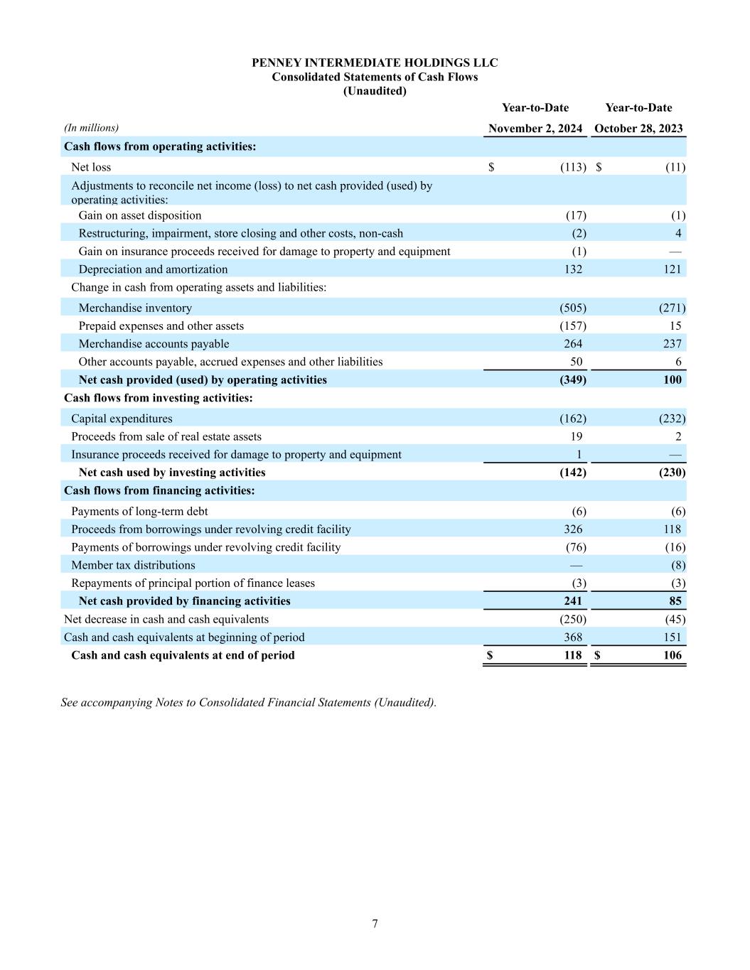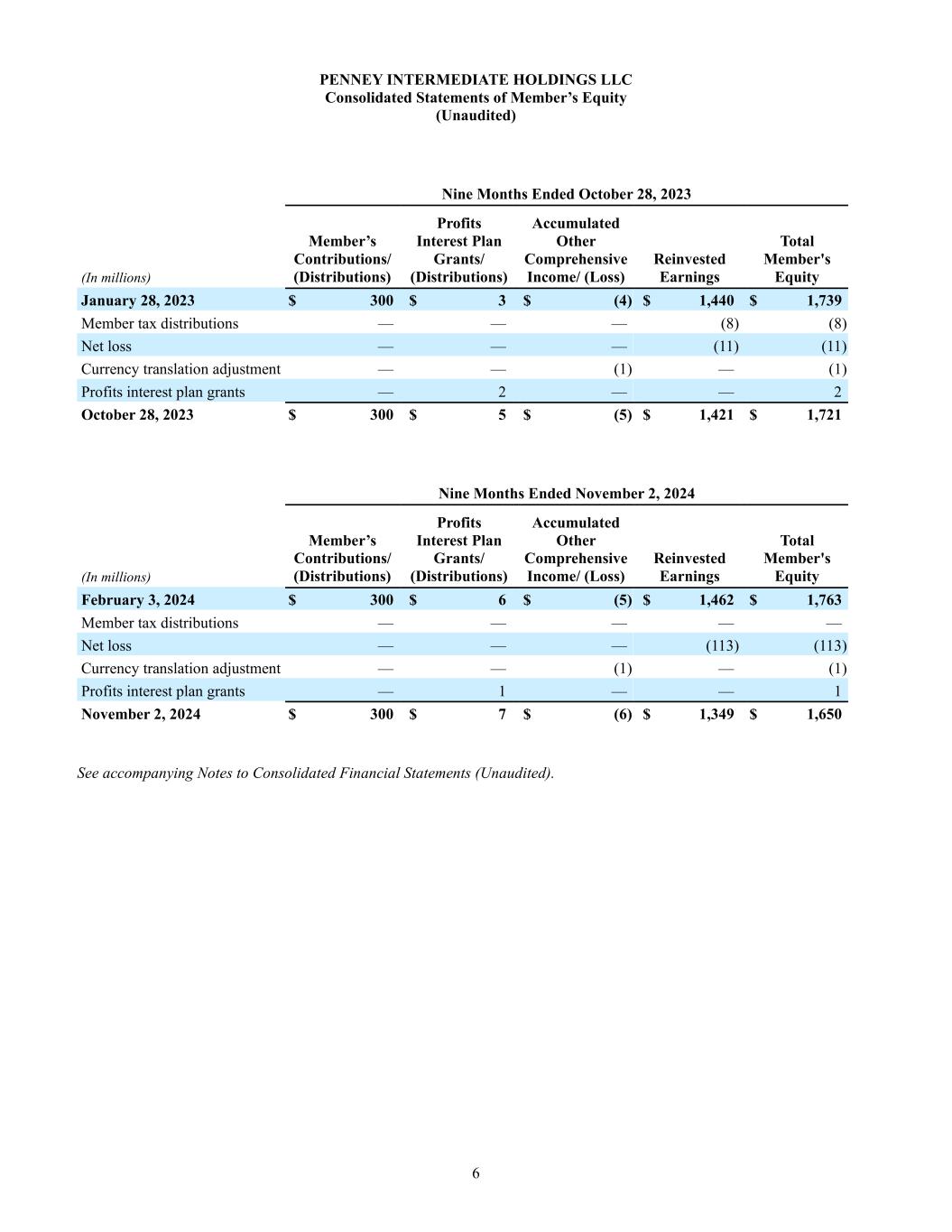 6 PENNEY INTERMEDIATE HOLDINGS LLC Consolidated Statements of Member’s Equity (Unaudited) Nine Months Ended October 28, 2023 (In millions) Member’s Contributions/ (Distributions) Profits Interest Plan Grants/ (Distributions) Accumulated Other Comprehensive Income/ (Loss) Reinvested Earnings Total Member's Equity January 28, 2023 $ 300 $ 3 $ (4) $ 1,440 $ 1,739 Member tax distributions — — — (8) (8) Net loss — — — (11) (11) Currency translation adjustment — — (1) — (1) Profits interest plan grants — 2 — — 2 October 28, 2023 $ 300 $ 5 $ (5) $ 1,421 $ 1,721 Nine Months Ended November 2, 2024 (In millions) Member’s Contributions/ (Distributions) Profits Interest Plan Grants/ (Distributions) Accumulated Other Comprehensive Income/ (Loss) Reinvested Earnings Total Member's Equity February 3, 2024 $ 300 $ 6 $ (5) $ 1,462 $ 1,763 Member tax distributions — — — — — Net loss — — — (113) (113) Currency translation adjustment — — (1) — (1) Profits interest plan grants — 1 — — 1 November 2, 2024 $ 300 $ 7 $ (6) $ 1,349 $ 1,650 See accompanying Notes to Consolidated Financial Statements (Unaudited).