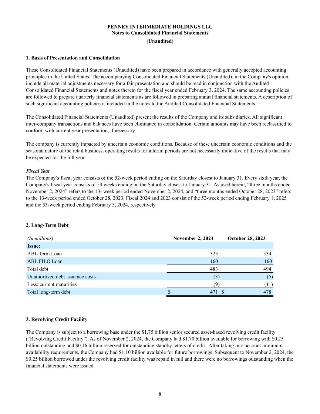 8 PENNEY INTERMEDIATE HOLDINGS LLC Notes to Consolidated Financial Statements (Unaudited) 1. Basis of Presentation and Consolidation These Consolidated Financial Statements (Unaudited) have been prepared in accordance with generally accepted accounting principles in the United States. The accompanying Consolidated Financial Statements (Unaudited), in the Company's opinion, include all material adjustments necessary for a fair presentation and should be read in conjunction with the Audited Consolidated Financial Statements and notes thereto for the fiscal year ended February 3, 2024. The same accounting policies are followed to prepare quarterly financial statements as are followed in preparing annual financial statements. A description of such significant accounting policies is included in the notes to the Audited Consolidated Financial Statements. The Consolidated Financial Statements (Unaudited) present the results of the Company and its subsidiaries. All significant inter-company transactions and balances have been eliminated in consolidation. Certain amounts may have been reclassified to conform with current year presentation, if necessary. The company is currently impacted by uncertain economic conditions. Because of these uncertain economic conditions and the seasonal nature of the retail business, operating results for interim periods are not necessarily indicative of the results that may be expected for the full year. Fiscal Year The Company’s fiscal year consists of the 52-week period ending on the Saturday closest to January 31. Every sixth year, the Company's fiscal year consists of 53 weeks ending on the Saturday closest to January 31. As used herein, “three months ended November 2, 2024” refers to the 13- week period ended November 2, 2024, and “three months ended October 28, 2023” refers to the 13-week period ended October 28, 2023. Fiscal 2024 and 2023 consist of the 52-week period ending February 1, 2025 and the 53-week period ending February 3, 2024, respectively. 2. Long-Term Debt (In millions) November 2, 2024 October 28, 2023 Issue: ABL Term Loan 323 334 ABL FILO Loan 160 160 Total debt 483 494 Unamortized debt issuance costs (3) (5) Less: current maturities (9) (11) Total long-term debt $ 471 $ 478 3. Revolving Credit Facility The Company is subject to a borrowing base under the $1.75 billion senior secured asset-based revolving credit facility (“Revolving Credit Facility”). As of November 2, 2024, the Company had $1.70 billion available for borrowing with $0.25 billion outstanding and $0.16 billion reserved for outstanding standby letters of credit. After taking into account minimum availability requirements, the Company had $1.10 billion available for future borrowings. Subsequent to November 2, 2024, the $0.25 billion borrowed under the revolving credit facility was repaid in full and there were no borrowings outstanding when the financial statements were issued.
