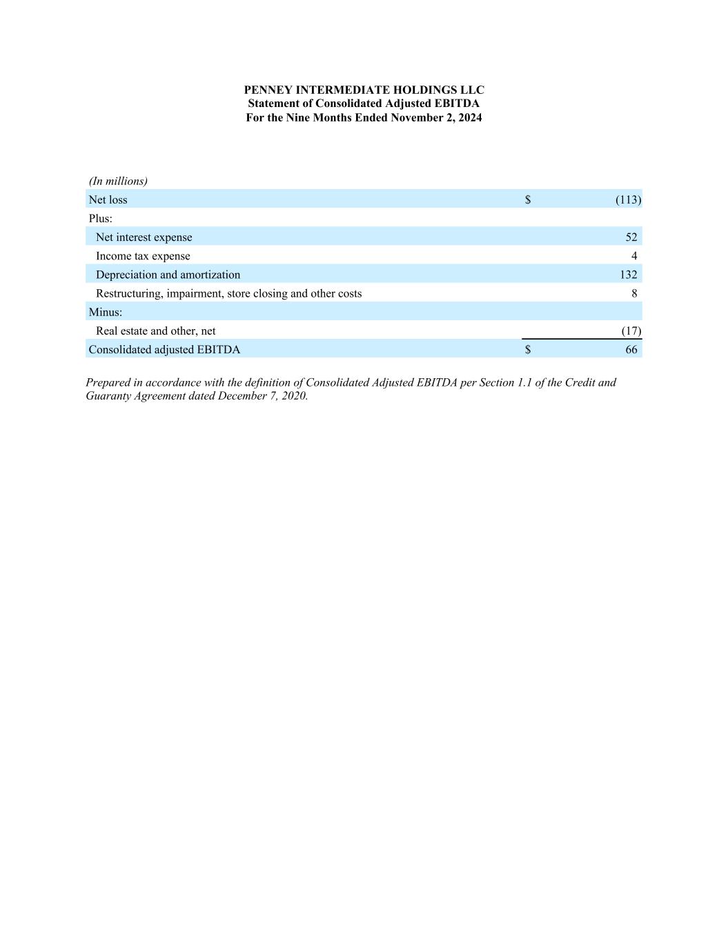 PENNEY INTERMEDIATE HOLDINGS LLC Statement of Consolidated Adjusted EBITDA For the Nine Months Ended November 2, 2024 (In millions) Net loss $ (113) Plus: Net interest expense 52 Income tax expense 4 Depreciation and amortization 132 Restructuring, impairment, store closing and other costs 8 Minus: Real estate and other, net (17) Consolidated adjusted EBITDA $ 66 Prepared in accordance with the definition of Consolidated Adjusted EBITDA per Section 1.1 of the Credit and Guaranty Agreement dated December 7, 2020.