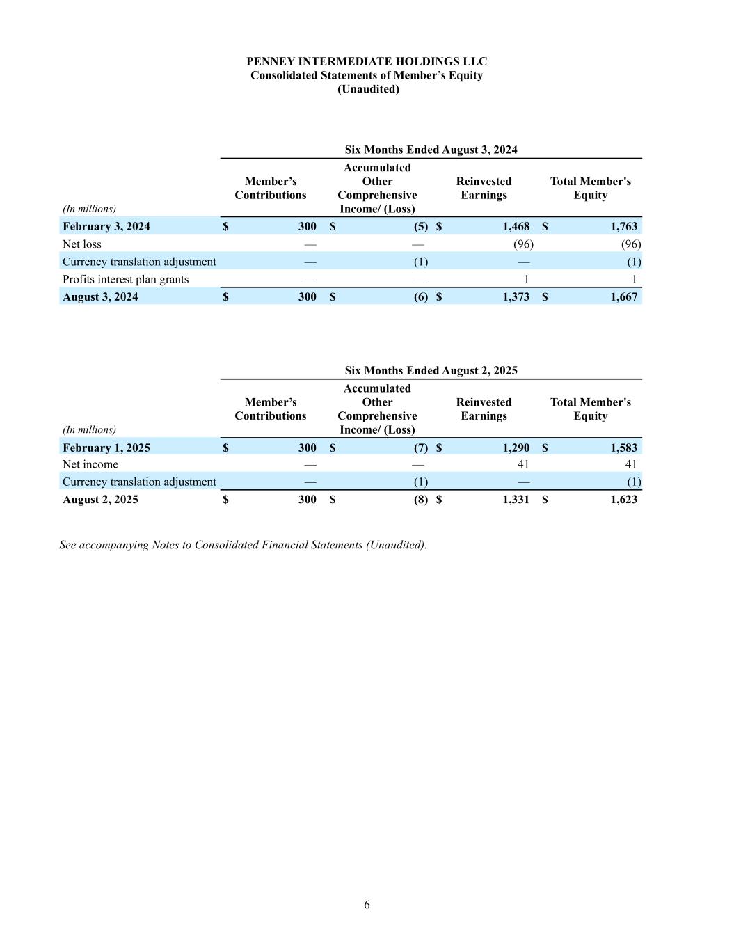 6 PENNEY INTERMEDIATE HOLDINGS LLC Consolidated Statements of Member’s Equity (Unaudited) Six Months Ended August 3, 2024 (In millions) Member’s Contributions Accumulated Other Comprehensive Income/ (Loss) Reinvested Earnings Total Member's Equity February 3, 2024 $ 300 $ (5) $ 1,468 $ 1,763 Net loss — — (96) (96) Currency translation adjustment — (1) — (1) Profits interest plan grants — — 1 1 August 3, 2024 $ 300 $ (6) $ 1,373 $ 1,667 Six Months Ended August 2, 2025 (In millions) Member’s Contributions Accumulated Other Comprehensive Income/ (Loss) Reinvested Earnings Total Member's Equity February 1, 2025 $ 300 $ (7) $ 1,290 $ 1,583 Net income — — 41 41 Currency translation adjustment — (1) — (1) August 2, 2025 $ 300 $ (8) $ 1,331 $ 1,623 See accompanying Notes to Consolidated Financial Statements (Unaudited).