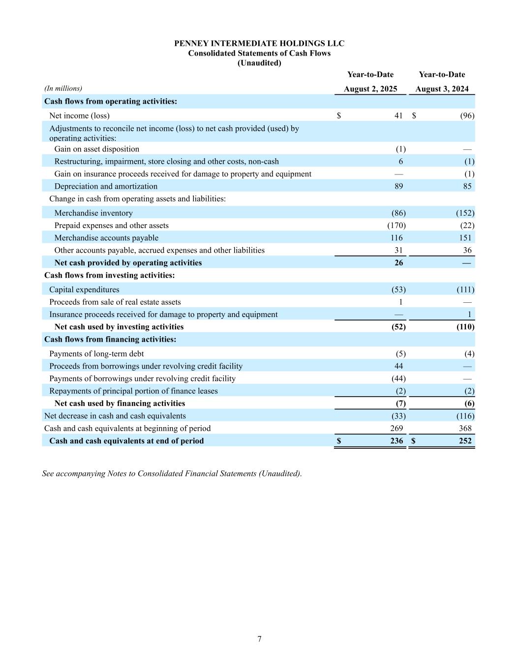 7 PENNEY INTERMEDIATE HOLDINGS LLC Consolidated Statements of Cash Flows (Unaudited) Year-to-Date Year-to-Date (In millions) August 2, 2025 August 3, 2024 Cash flows from operating activities: Net income (loss) $ 41 $ (96) Adjustments to reconcile net income (loss) to net cash provided (used) by operating activities: Gain on asset disposition (1) — Restructuring, impairment, store closing and other costs, non-cash 6 (1) Gain on insurance proceeds received for damage to property and equipment — (1) Depreciation and amortization 89 85 Change in cash from operating assets and liabilities: Merchandise inventory (86) (152) Prepaid expenses and other assets (170) (22) Merchandise accounts payable 116 151 Other accounts payable, accrued expenses and other liabilities 31 36 Net cash provided by operating activities 26 — Cash flows from investing activities: Capital expenditures (53) (111) Proceeds from sale of real estate assets 1 — Insurance proceeds received for damage to property and equipment — 1 Net cash used by investing activities (52) (110) Cash flows from financing activities: Payments of long-term debt (5) (4) Proceeds from borrowings under revolving credit facility 44 — Payments of borrowings under revolving credit facility (44) — Repayments of principal portion of finance leases (2) (2) Net cash used by financing activities (7) (6) Net decrease in cash and cash equivalents (33) (116) Cash and cash equivalents at beginning of period 269 368 Cash and cash equivalents at end of period $ 236 $ 252 See accompanying Notes to Consolidated Financial Statements (Unaudited).