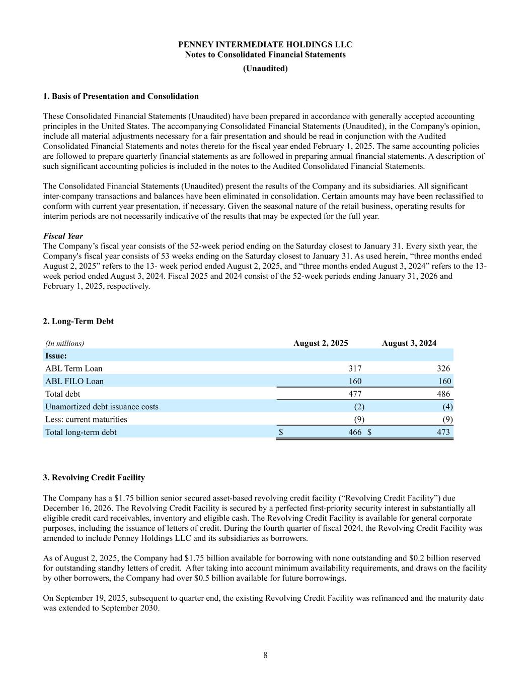 8 PENNEY INTERMEDIATE HOLDINGS LLC Notes to Consolidated Financial Statements (Unaudited) 1. Basis of Presentation and Consolidation These Consolidated Financial Statements (Unaudited) have been prepared in accordance with generally accepted accounting principles in the United States. The accompanying Consolidated Financial Statements (Unaudited), in the Company's opinion, include all material adjustments necessary for a fair presentation and should be read in conjunction with the Audited Consolidated Financial Statements and notes thereto for the fiscal year ended February 1, 2025. The same accounting policies are followed to prepare quarterly financial statements as are followed in preparing annual financial statements. A description of such significant accounting policies is included in the notes to the Audited Consolidated Financial Statements. The Consolidated Financial Statements (Unaudited) present the results of the Company and its subsidiaries. All significant inter-company transactions and balances have been eliminated in consolidation. Certain amounts may have been reclassified to conform with current year presentation, if necessary. Given the seasonal nature of the retail business, operating results for interim periods are not necessarily indicative of the results that may be expected for the full year. Fiscal Year The Company’s fiscal year consists of the 52-week period ending on the Saturday closest to January 31. Every sixth year, the Company's fiscal year consists of 53 weeks ending on the Saturday closest to January 31. As used herein, “three months ended August 2, 2025” refers to the 13- week period ended August 2, 2025, and “three months ended August 3, 2024” refers to the 13- week period ended August 3, 2024. Fiscal 2025 and 2024 consist of the 52-week periods ending January 31, 2026 and February 1, 2025, respectively. 2. Long-Term Debt (In millions) August 2, 2025 August 3, 2024 Issue: ABL Term Loan 317 326 ABL FILO Loan 160 160 Total debt 477 486 Unamortized debt issuance costs (2) (4) Less: current maturities (9) (9) Total long-term debt $ 466 $ 473 3. Revolving Credit Facility The Company has a $1.75 billion senior secured asset-based revolving credit facility (“Revolving Credit Facility”) due December 16, 2026. The Revolving Credit Facility is secured by a perfected first-priority security interest in substantially all eligible credit card receivables, inventory and eligible cash. The Revolving Credit Facility is available for general corporate purposes, including the issuance of letters of credit. During the fourth quarter of fiscal 2024, the Revolving Credit Facility was amended to include Penney Holdings LLC and its subsidiaries as borrowers. As of August 2, 2025, the Company had $1.75 billion available for borrowing with none outstanding and $0.2 billion reserved for outstanding standby letters of credit. After taking into account minimum availability requirements, and draws on the facility by other borrowers, the Company had over $0.5 billion available for future borrowings. On September 19, 2025, subsequent to quarter end, the existing Revolving Credit Facility was refinanced and the maturity date was extended to September 2030.