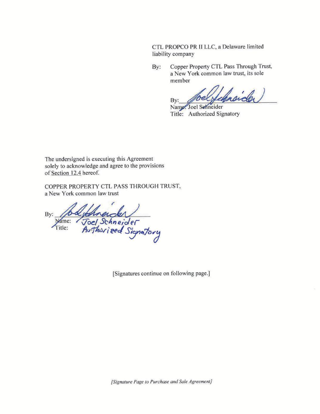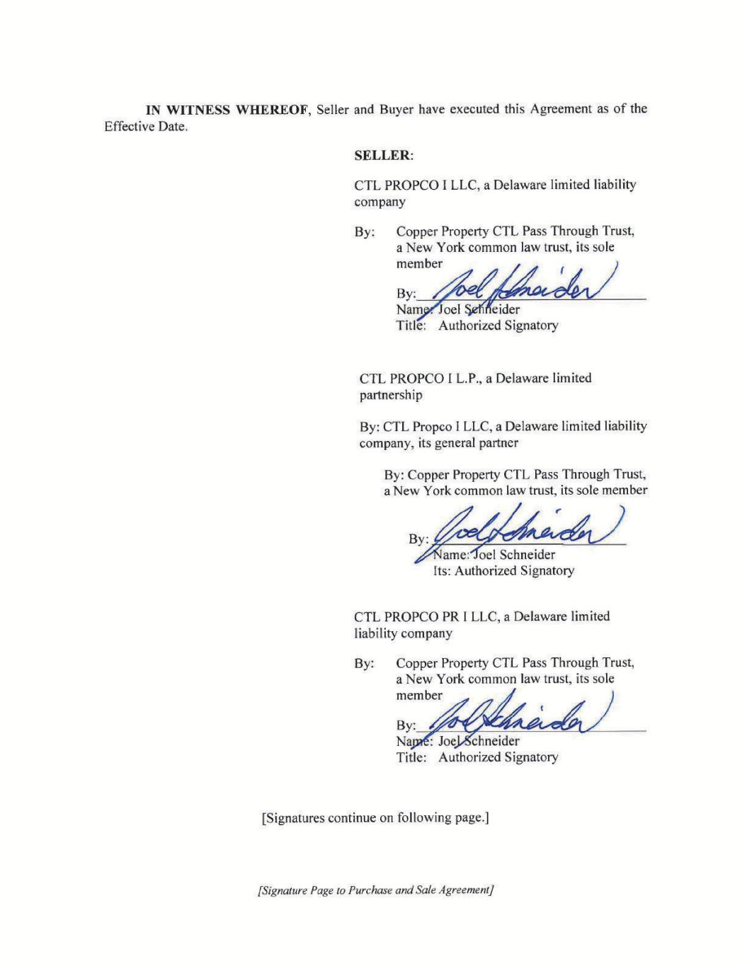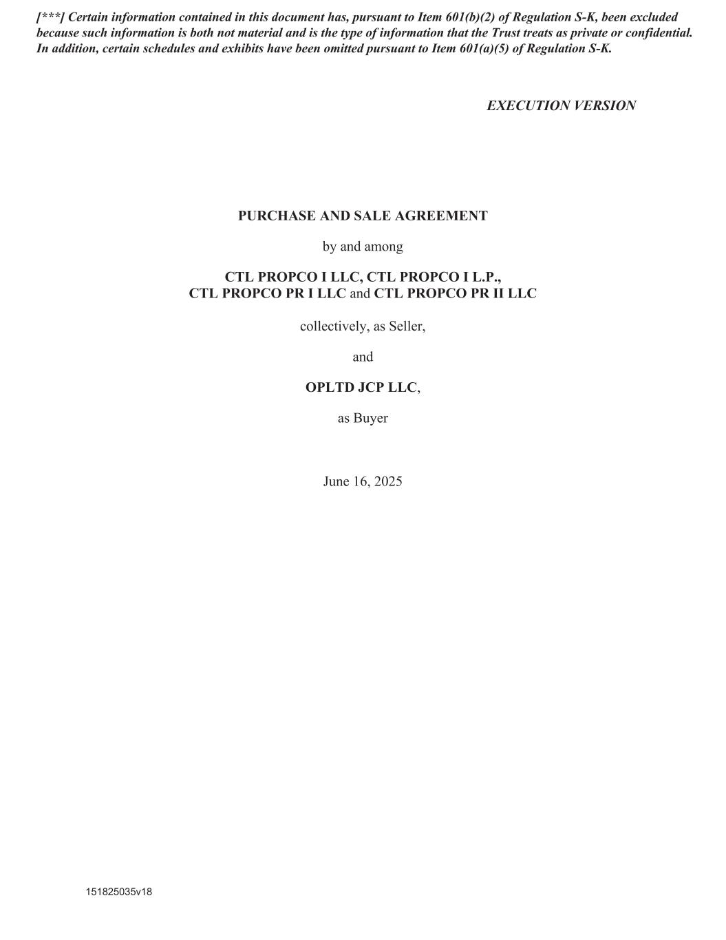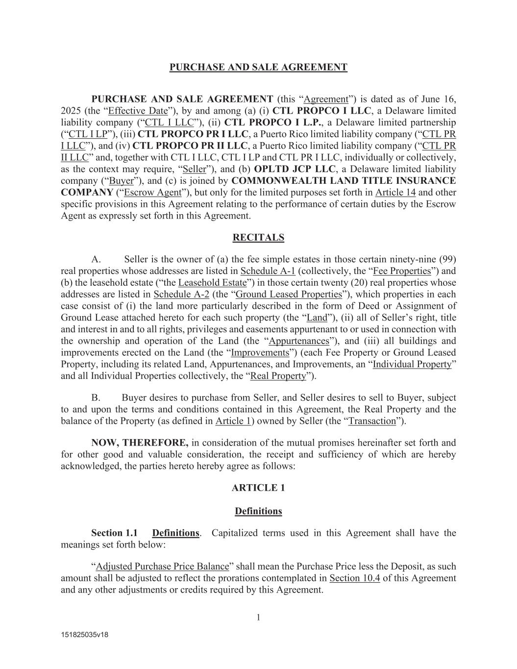 1 151825035v18 PURCHASE AND SALE AGREEMENT PURCHASE AND SALE AGREEMENT (this “Agreement”) is dated as of June 16, 2025 (the “Effective Date”), by and among (a) (i) CTL PROPCO I LLC, a Delaware limited liability company (“CTL I LLC”), (ii) CTL PROPCO I L.P., a Delaware limited partnership (“CTL I LP”), (iii) CTL PROPCO PR I LLC, a Puerto Rico limited liability company (“CTL PR I LLC”), and (iv) CTL PROPCO PR II LLC, a Puerto Rico limited liability company (“CTL PR II LLC” and, together with CTL I LLC, CTL I LP and CTL PR I LLC, individually or collectively, as the context may require, “Seller”), and (b) OPLTD JCP LLC, a Delaware limited liability company (“Buyer”), and (c) is joined by COMMONWEALTH LAND TITLE INSURANCE COMPANY (“Escrow Agent”), but only for the limited purposes set forth in Article 14 and other specific provisions in this Agreement relating to the performance of certain duties by the Escrow Agent as expressly set forth in this Agreement. RECITALS A. Seller is the owner of (a) the fee simple estates in those certain ninety-nine (99) real properties whose addresses are listed in Schedule A-1 (collectively, the “Fee Properties”) and (b) the leasehold estate (“the Leasehold Estate”) in those certain twenty (20) real properties whose addresses are listed in Schedule A-2 (the “Ground Leased Properties”), which properties in each case consist of (i) the land more particularly described in the form of Deed or Assignment of Ground Lease attached hereto for each such property (the “Land”), (ii) all of Seller’s right, title and interest in and to all rights, privileges and easements appurtenant to or used in connection with the ownership and operation of the Land (the “Appurtenances”), and (iii) all buildings and improvements erected on the Land (the “Improvements”) (each Fee Property or Ground Leased Property, including its related Land, Appurtenances, and Improvements, an “Individual Property” and all Individual Properties collectively, the “Real Property”). B. Buyer desires to purchase from Seller, and Seller desires to sell to Buyer, subject to and upon the terms and conditions contained in this Agreement, the Real Property and the balance of the Property (as defined in Article 1) owned by Seller (the “Transaction”). NOW, THEREFORE, in consideration of the mutual promises hereinafter set forth and for other good and valuable consideration, the receipt and sufficiency of which are hereby acknowledged, the parties hereto hereby agree as follows: ARTICLE 1 Definitions Section 1.1 Definitions. Capitalized terms used in this Agreement shall have the meanings set forth below: “Adjusted Purchase Price Balance” shall mean the Purchase Price less the Deposit, as such amount shall be adjusted to reflect the prorations contemplated in Section 10.4 of this Agreement and any other adjustments or credits required by this Agreement.