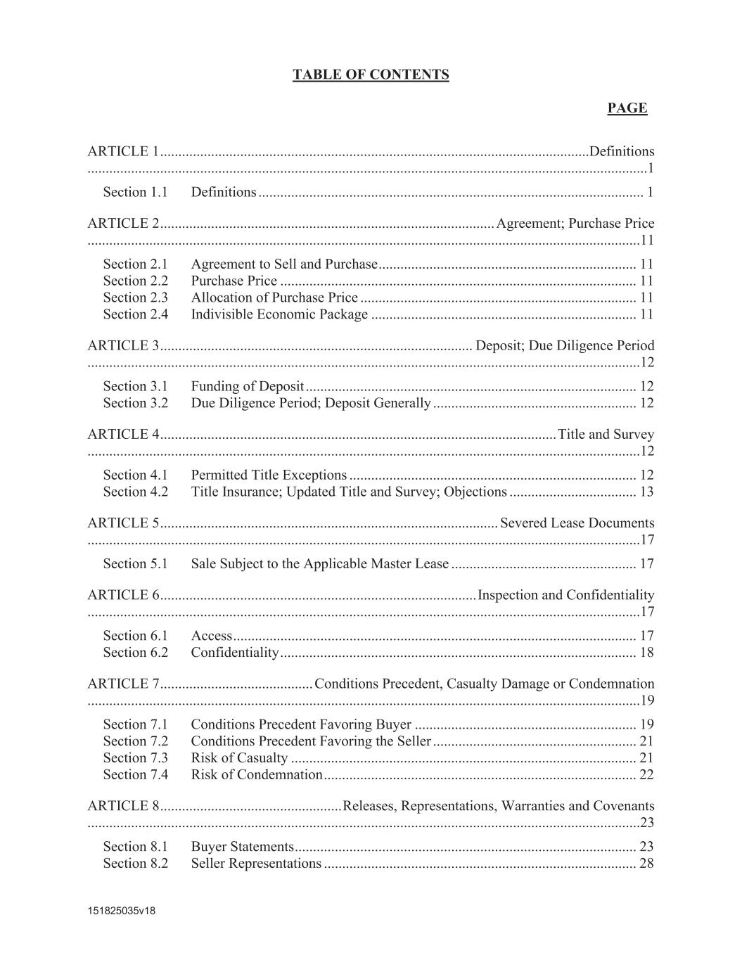 TABLE OF CONTENTS PAGE 151825035v18 ARTICLE 1 ......................................................................................................................Definitions ..........................................................................................................................................................1 Section 1.1 Definitions .......................................................................................................... 1 ARTICLE 2 ............................................................................................ Agreement; Purchase Price ........................................................................................................................................................11 Section 2.1 Agreement to Sell and Purchase ....................................................................... 11 Section 2.2 Purchase Price .................................................................................................. 11 Section 2.3 Allocation of Purchase Price ............................................................................ 11 Section 2.4 Indivisible Economic Package ......................................................................... 11 ARTICLE 3 ...................................................................................... Deposit; Due Diligence Period ........................................................................................................................................................12 Section 3.1 Funding of Deposit ........................................................................................... 12 Section 3.2 Due Diligence Period; Deposit Generally ........................................................ 12 ARTICLE 4 ............................................................................................................. Title and Survey ........................................................................................................................................................12 Section 4.1 Permitted Title Exceptions ............................................................................... 12 Section 4.2 Title Insurance; Updated Title and Survey; Objections ................................... 13 ARTICLE 5 ............................................................................................. Severed Lease Documents ........................................................................................................................................................17 Section 5.1 Sale Subject to the Applicable Master Lease ................................................... 17 ARTICLE 6 ....................................................................................... Inspection and Confidentiality ........................................................................................................................................................17 Section 6.1 Access ............................................................................................................... 17 Section 6.2 Confidentiality .................................................................................................. 18 ARTICLE 7 .......................................... Conditions Precedent, Casualty Damage or Condemnation ........................................................................................................................................................19 Section 7.1 Conditions Precedent Favoring Buyer ............................................................. 19 Section 7.2 Conditions Precedent Favoring the Seller ........................................................ 21 Section 7.3 Risk of Casualty ............................................................................................... 21 Section 7.4 Risk of Condemnation ...................................................................................... 22 ARTICLE 8 .................................................. Releases, Representations, Warranties and Covenants ........................................................................................................................................................23 Section 8.1 Buyer Statements .............................................................................................. 23 Section 8.2 Seller Representations ...................................................................................... 28