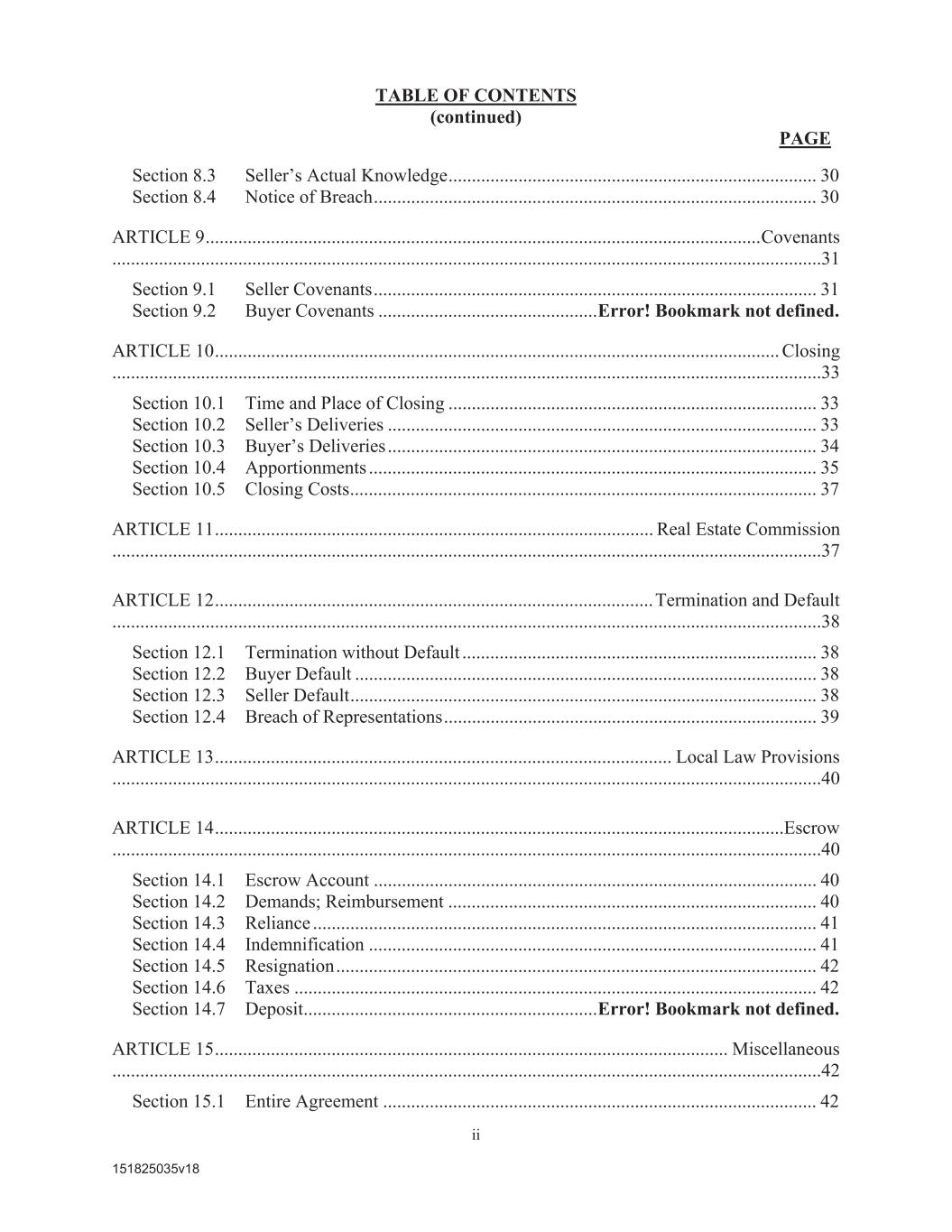 TABLE OF CONTENTS (continued) PAGE ii 151825035v18 Section 8.3 Seller’s Actual Knowledge ............................................................................... 30 Section 8.4 Notice of Breach ............................................................................................... 30 ARTICLE 9 ....................................................................................................................... Covenants ........................................................................................................................................................31 Section 9.1 Seller Covenants ............................................................................................... 31 Section 9.2 Buyer Covenants ............................................... Error! Bookmark not defined. ARTICLE 10 ......................................................................................................................... Closing ........................................................................................................................................................33 Section 10.1 Time and Place of Closing ............................................................................... 33 Section 10.2 Seller’s Deliveries ............................................................................................ 33 Section 10.3 Buyer’s Deliveries ............................................................................................ 34 Section 10.4 Apportionments ................................................................................................ 35 Section 10.5 Closing Costs .................................................................................................... 37 ARTICLE 11 .............................................................................................. Real Estate Commission ........................................................................................................................................................37 ARTICLE 12 .............................................................................................. Termination and Default ........................................................................................................................................................38 Section 12.1 Termination without Default ............................................................................ 38 Section 12.2 Buyer Default ................................................................................................... 38 Section 12.3 Seller Default .................................................................................................... 38 Section 12.4 Breach of Representations ................................................................................ 39 ARTICLE 13 .................................................................................................. Local Law Provisions ........................................................................................................................................................40 ARTICLE 14 ..........................................................................................................................Escrow ........................................................................................................................................................40 Section 14.1 Escrow Account ............................................................................................... 40 Section 14.2 Demands; Reimbursement ............................................................................... 40 Section 14.3 Reliance ............................................................................................................ 41 Section 14.4 Indemnification ................................................................................................ 41 Section 14.5 Resignation ....................................................................................................... 42 Section 14.6 Taxes ................................................................................................................ 42 Section 14.7 Deposit ............................................................... Error! Bookmark not defined. ARTICLE 15 .............................................................................................................. Miscellaneous ........................................................................................................................................................42 Section 15.1 Entire Agreement ............................................................................................. 42