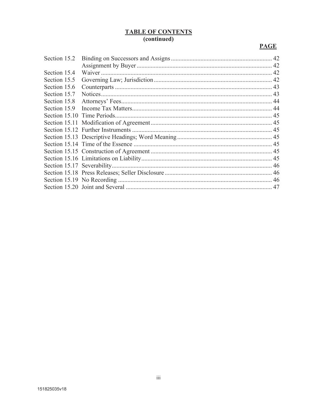 TABLE OF CONTENTS (continued) PAGE iii 151825035v18 Section 15.2 Binding on Successors and Assigns ................................................................. 42 Assignment by Buyer ....................................................................................... 42 Section 15.4 Waiver .............................................................................................................. 42 Section 15.5 Governing Law; Jurisdiction ............................................................................ 42 Section 15.6 Counterparts ..................................................................................................... 43 Section 15.7 Notices .............................................................................................................. 43 Section 15.8 Attorneys’ Fees ................................................................................................. 44 Section 15.9 Income Tax Matters .......................................................................................... 44 Section 15.10 Time Periods ..................................................................................................... 45 Section 15.11 Modification of Agreement .............................................................................. 45 Section 15.12 Further Instruments .......................................................................................... 45 Section 15.13 Descriptive Headings; Word Meaning ............................................................. 45 Section 15.14 Time of the Essence ......................................................................................... 45 Section 15.15 Construction of Agreement .............................................................................. 45 Section 15.16 Limitations on Liability .................................................................................... 45 Section 15.17 Severability ....................................................................................................... 46 Section 15.18 Press Releases; Seller Disclosure ..................................................................... 46 Section 15.19 No Recording ................................................................................................... 46 Section 15.20 Joint and Several .............................................................................................. 47