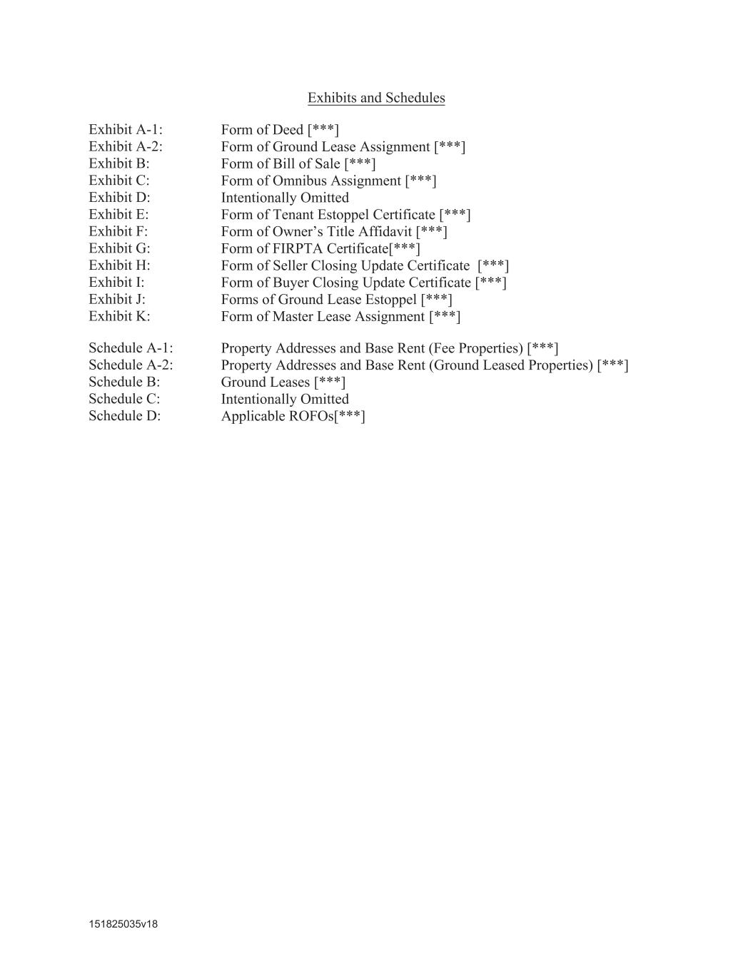 151825035v18 Exhibits and Schedules Exhibit A-1: Exhibit A-2: Exhibit B: Exhibit C: Exhibit D: Exhibit E: Exhibit F: Exhibit G: Exhibit H: Exhibit I: Exhibit J: Exhibit K: Schedule A-1: Schedule A-2: Schedule B: Schedule C: Schedule D: Form of Deed Form of Ground Lease Assignment Form of Bill of Sale Form of Omnibus Assignment Intentionally Omitted Form of Tenant Estoppel Certificate Form of Owner’s Title Affidavit Form of FIRPTA Certificate Form of Seller Closing Update Certificate Form of Buyer Closing Update Certificate Forms of Ground Lease Estoppel Form of Master Lease Assignment Property Addresses and Base Rent (Fee Properties) Property Addresses and Base Rent (Ground Leased Properties) Ground Leases Intentionally Omitted Applicable ROFOs