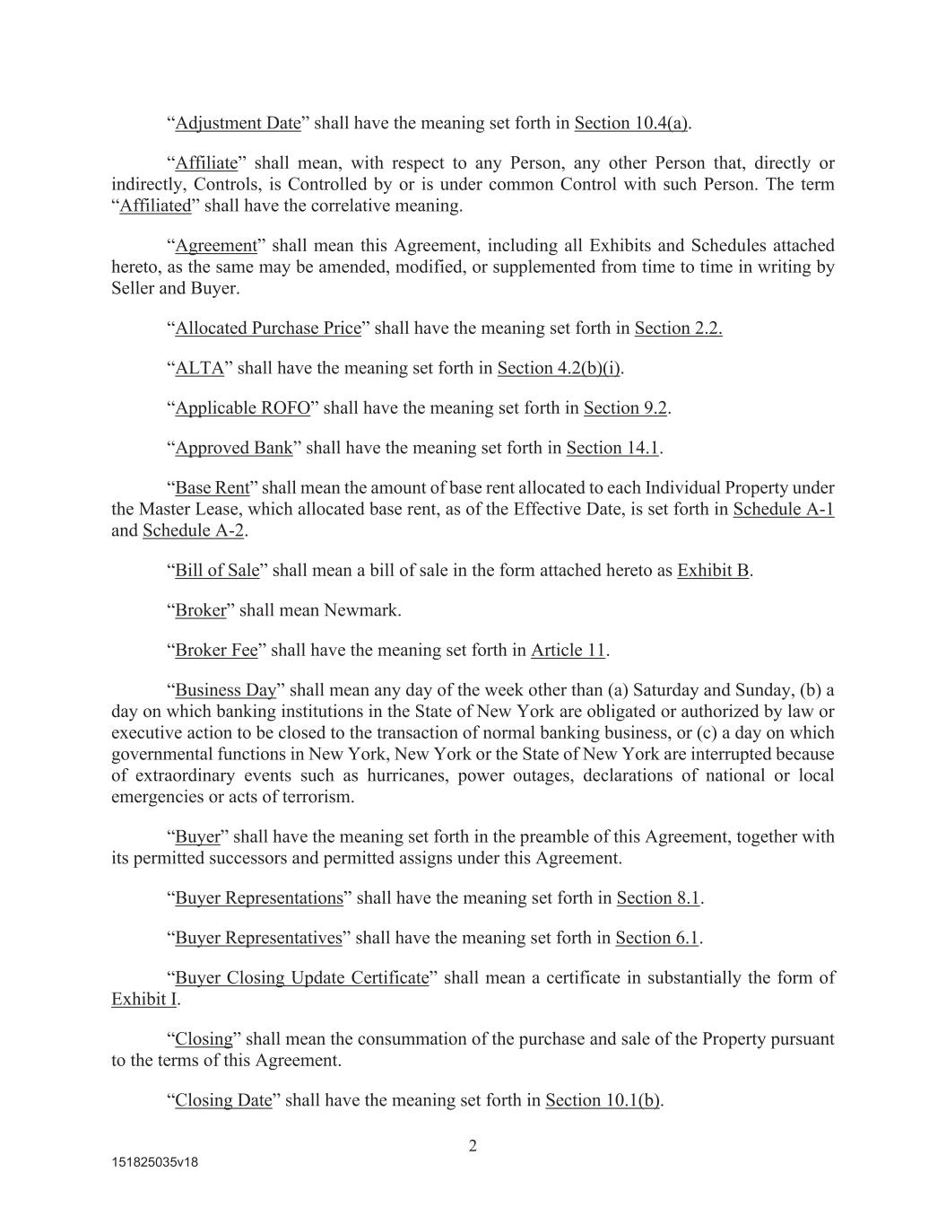 2 151825035v18 “Adjustment Date” shall have the meaning set forth in Section 10.4(a). “Affiliate” shall mean, with respect to any Person, any other Person that, directly or indirectly, Controls, is Controlled by or is under common Control with such Person. The term “Affiliated” shall have the correlative meaning. “Agreement” shall mean this Agreement, including all Exhibits and Schedules attached hereto, as the same may be amended, modified, or supplemented from time to time in writing by Seller and Buyer. “Allocated Purchase Price” shall have the meaning set forth in Section 2.2. “ALTA” shall have the meaning set forth in Section 4.2(b)(i). “Applicable ROFO” shall have the meaning set forth in Section 9.2. “Approved Bank” shall have the meaning set forth in Section 14.1. “Base Rent” shall mean the amount of base rent allocated to each Individual Property under the Master Lease, which allocated base rent, as of the Effective Date, is set forth in Schedule A-1 and Schedule A-2. “Bill of Sale” shall mean a bill of sale in the form attached hereto as Exhibit B. “Broker” shall mean Newmark. “Broker Fee” shall have the meaning set forth in Article 11. “Business Day” shall mean any day of the week other than (a) Saturday and Sunday, (b) a day on which banking institutions in the State of New York are obligated or authorized by law or executive action to be closed to the transaction of normal banking business, or (c) a day on which governmental functions in New York, New York or the State of New York are interrupted because of extraordinary events such as hurricanes, power outages, declarations of national or local emergencies or acts of terrorism. “Buyer” shall have the meaning set forth in the preamble of this Agreement, together with its permitted successors and permitted assigns under this Agreement. “Buyer Representations” shall have the meaning set forth in Section 8.1. “Buyer Representatives” shall have the meaning set forth in Section 6.1. “Buyer Closing Update Certificate” shall mean a certificate in substantially the form of Exhibit I. “Closing” shall mean the consummation of the purchase and sale of the Property pursuant to the terms of this Agreement. “Closing Date” shall have the meaning set forth in Section 10.1(b).