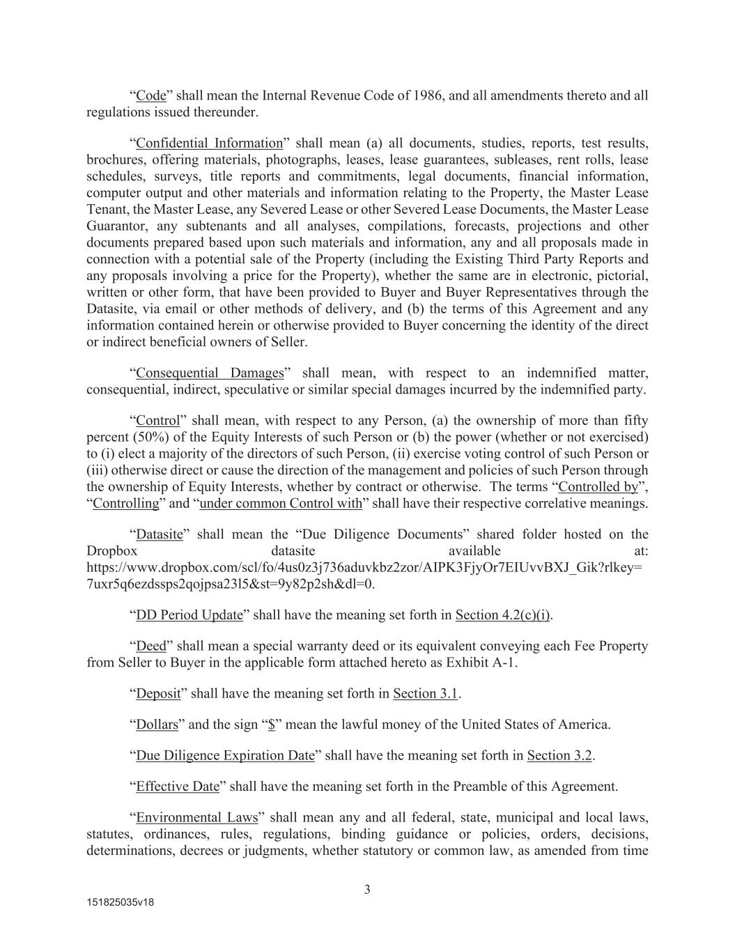3 151825035v18 “Code” shall mean the Internal Revenue Code of 1986, and all amendments thereto and all regulations issued thereunder. “Confidential Information” shall mean (a) all documents, studies, reports, test results, brochures, offering materials, photographs, leases, lease guarantees, subleases, rent rolls, lease schedules, surveys, title reports and commitments, legal documents, financial information, computer output and other materials and information relating to the Property, the Master Lease Tenant, the Master Lease, any Severed Lease or other Severed Lease Documents, the Master Lease Guarantor, any subtenants and all analyses, compilations, forecasts, projections and other documents prepared based upon such materials and information, any and all proposals made in connection with a potential sale of the Property (including the Existing Third Party Reports and any proposals involving a price for the Property), whether the same are in electronic, pictorial, written or other form, that have been provided to Buyer and Buyer Representatives through the Datasite, via email or other methods of delivery, and (b) the terms of this Agreement and any information contained herein or otherwise provided to Buyer concerning the identity of the direct or indirect beneficial owners of Seller. “Consequential Damages” shall mean, with respect to an indemnified matter, consequential, indirect, speculative or similar special damages incurred by the indemnified party. “Control” shall mean, with respect to any Person, (a) the ownership of more than fifty percent (50%) of the Equity Interests of such Person or (b) the power (whether or not exercised) to (i) elect a majority of the directors of such Person, (ii) exercise voting control of such Person or (iii) otherwise direct or cause the direction of the management and policies of such Person through the ownership of Equity Interests, whether by contract or otherwise. The terms “Controlled by”, “Controlling” and “under common Control with” shall have their respective correlative meanings. “Datasite” shall mean the “Due Diligence Documents” shared folder hosted on the Dropbox datasite available at: https://www.dropbox.com/scl/fo/4us0z3j736aduvkbz2zor/AIPK3FjyOr7EIUvvBXJ_Gik?rlkey= 7uxr5q6ezdssps2qojpsa23l5&st=9y82p2sh&dl=0. “DD Period Update” shall have the meaning set forth in Section 4.2(c)(i). “Deed” shall mean a special warranty deed or its equivalent conveying each Fee Property from Seller to Buyer in the applicable form attached hereto as Exhibit A-1. “Deposit” shall have the meaning set forth in Section 3.1. “Dollars” and the sign “$” mean the lawful money of the United States of America. “Due Diligence Expiration Date” shall have the meaning set forth in Section 3.2. “Effective Date” shall have the meaning set forth in the Preamble of this Agreement. “Environmental Laws” shall mean any and all federal, state, municipal and local laws, statutes, ordinances, rules, regulations, binding guidance or policies, orders, decisions, determinations, decrees or judgments, whether statutory or common law, as amended from time