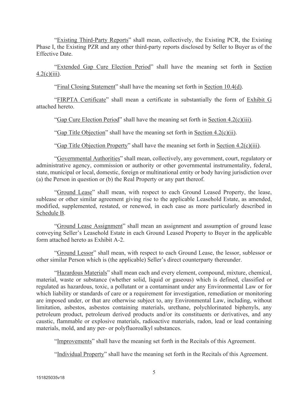5 151825035v18 “Existing Third-Party Reports” shall mean, collectively, the Existing PCR, the Existing Phase I, the Existing PZR and any other third-party reports disclosed by Seller to Buyer as of the Effective Date. “Extended Gap Cure Election Period” shall have the meaning set forth in Section 4.2(c)(iii). “Final Closing Statement” shall have the meaning set forth in Section 10.4(d). “FIRPTA Certificate” shall mean a certificate in substantially the form of Exhibit G attached hereto. “Gap Cure Election Period” shall have the meaning set forth in Section 4.2(c)(iii). “Gap Title Objection” shall have the meaning set forth in Section 4.2(c)(ii). “Gap Title Objection Property” shall have the meaning set forth in Section 4.2(c)(iii). “Governmental Authorities” shall mean, collectively, any government, court, regulatory or administrative agency, commission or authority or other governmental instrumentality, federal, state, municipal or local, domestic, foreign or multinational entity or body having jurisdiction over (a) the Person in question or (b) the Real Property or any part thereof. “Ground Lease” shall mean, with respect to each Ground Leased Property, the lease, sublease or other similar agreement giving rise to the applicable Leasehold Estate, as amended, modified, supplemented, restated, or renewed, in each case as more particularly described in Schedule B. “Ground Lease Assignment” shall mean an assignment and assumption of ground lease conveying Seller’s Leasehold Estate in each Ground Leased Property to Buyer in the applicable form attached hereto as Exhibit A-2. “Ground Lessor” shall mean, with respect to each Ground Lease, the lessor, sublessor or other similar Person which is (the applicable) Seller’s direct counterparty thereunder. “Hazardous Materials” shall mean each and every element, compound, mixture, chemical, material, waste or substance (whether solid, liquid or gaseous) which is defined, classified or regulated as hazardous, toxic, a pollutant or a contaminant under any Environmental Law or for which liability or standards of care or a requirement for investigation, remediation or monitoring are imposed under, or that are otherwise subject to, any Environmental Law, including, without limitation, asbestos, asbestos containing materials, urethane, polychlorinated biphenyls, any petroleum product, petroleum derived products and/or its constituents or derivatives, and any caustic, flammable or explosive materials, radioactive materials, radon, lead or lead containing materials, mold, and any per- or polyfluoroalkyl substances. “Improvements” shall have the meaning set forth in the Recitals of this Agreement. “Individual Property” shall have the meaning set forth in the Recitals of this Agreement.