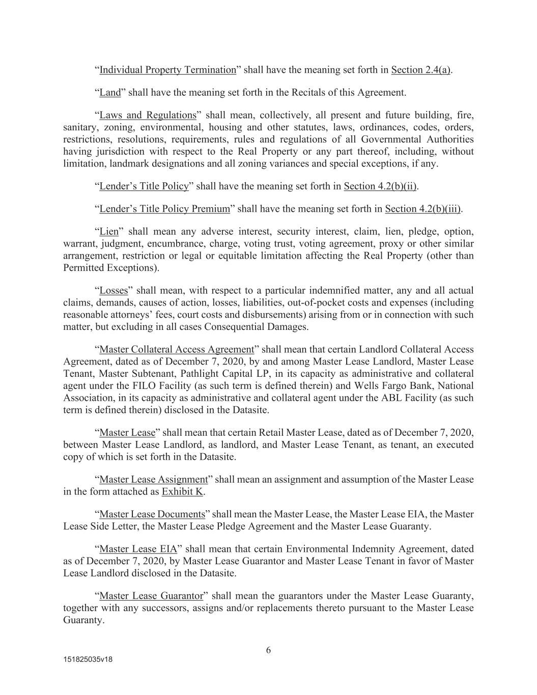 6 151825035v18 “Individual Property Termination” shall have the meaning set forth in Section 2.4(a). “Land” shall have the meaning set forth in the Recitals of this Agreement. “Laws and Regulations” shall mean, collectively, all present and future building, fire, sanitary, zoning, environmental, housing and other statutes, laws, ordinances, codes, orders, restrictions, resolutions, requirements, rules and regulations of all Governmental Authorities having jurisdiction with respect to the Real Property or any part thereof, including, without limitation, landmark designations and all zoning variances and special exceptions, if any. “Lender’s Title Policy” shall have the meaning set forth in Section 4.2(b)(ii). “Lender’s Title Policy Premium” shall have the meaning set forth in Section 4.2(b)(iii). “Lien” shall mean any adverse interest, security interest, claim, lien, pledge, option, warrant, judgment, encumbrance, charge, voting trust, voting agreement, proxy or other similar arrangement, restriction or legal or equitable limitation affecting the Real Property (other than Permitted Exceptions). “Losses” shall mean, with respect to a particular indemnified matter, any and all actual claims, demands, causes of action, losses, liabilities, out-of-pocket costs and expenses (including reasonable attorneys’ fees, court costs and disbursements) arising from or in connection with such matter, but excluding in all cases Consequential Damages. “Master Collateral Access Agreement” shall mean that certain Landlord Collateral Access Agreement, dated as of December 7, 2020, by and among Master Lease Landlord, Master Lease Tenant, Master Subtenant, Pathlight Capital LP, in its capacity as administrative and collateral agent under the FILO Facility (as such term is defined therein) and Wells Fargo Bank, National Association, in its capacity as administrative and collateral agent under the ABL Facility (as such term is defined therein) disclosed in the Datasite. “Master Lease” shall mean that certain Retail Master Lease, dated as of December 7, 2020, between Master Lease Landlord, as landlord, and Master Lease Tenant, as tenant, an executed copy of which is set forth in the Datasite. “Master Lease Assignment” shall mean an assignment and assumption of the Master Lease in the form attached as Exhibit K. “Master Lease Documents” shall mean the Master Lease, the Master Lease EIA, the Master Lease Side Letter, the Master Lease Pledge Agreement and the Master Lease Guaranty. “Master Lease EIA” shall mean that certain Environmental Indemnity Agreement, dated as of December 7, 2020, by Master Lease Guarantor and Master Lease Tenant in favor of Master Lease Landlord disclosed in the Datasite. “Master Lease Guarantor” shall mean the guarantors under the Master Lease Guaranty, together with any successors, assigns and/or replacements thereto pursuant to the Master Lease Guaranty.