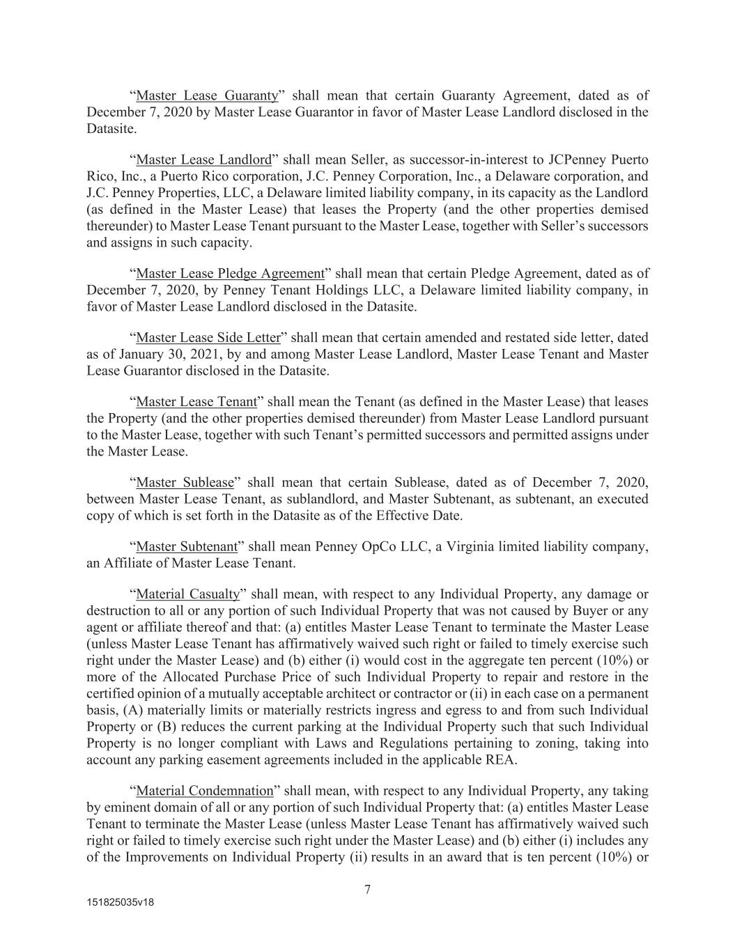 7 151825035v18 “Master Lease Guaranty” shall mean that certain Guaranty Agreement, dated as of December 7, 2020 by Master Lease Guarantor in favor of Master Lease Landlord disclosed in the Datasite. “Master Lease Landlord” shall mean Seller, as successor-in-interest to JCPenney Puerto Rico, Inc., a Puerto Rico corporation, J.C. Penney Corporation, Inc., a Delaware corporation, and J.C. Penney Properties, LLC, a Delaware limited liability company, in its capacity as the Landlord (as defined in the Master Lease) that leases the Property (and the other properties demised thereunder) to Master Lease Tenant pursuant to the Master Lease, together with Seller’s successors and assigns in such capacity. “Master Lease Pledge Agreement” shall mean that certain Pledge Agreement, dated as of December 7, 2020, by Penney Tenant Holdings LLC, a Delaware limited liability company, in favor of Master Lease Landlord disclosed in the Datasite. “Master Lease Side Letter” shall mean that certain amended and restated side letter, dated as of January 30, 2021, by and among Master Lease Landlord, Master Lease Tenant and Master Lease Guarantor disclosed in the Datasite. “Master Lease Tenant” shall mean the Tenant (as defined in the Master Lease) that leases the Property (and the other properties demised thereunder) from Master Lease Landlord pursuant to the Master Lease, together with such Tenant’s permitted successors and permitted assigns under the Master Lease. “Master Sublease” shall mean that certain Sublease, dated as of December 7, 2020, between Master Lease Tenant, as sublandlord, and Master Subtenant, as subtenant, an executed copy of which is set forth in the Datasite as of the Effective Date. “Master Subtenant” shall mean Penney OpCo LLC, a Virginia limited liability company, an Affiliate of Master Lease Tenant. “Material Casualty” shall mean, with respect to any Individual Property, any damage or destruction to all or any portion of such Individual Property that was not caused by Buyer or any agent or affiliate thereof and that: (a) entitles Master Lease Tenant to terminate the Master Lease (unless Master Lease Tenant has affirmatively waived such right or failed to timely exercise such right under the Master Lease) and (b) either (i) would cost in the aggregate ten percent (10%) or more of the Allocated Purchase Price of such Individual Property to repair and restore in the certified opinion of a mutually acceptable architect or contractor or (ii) in each case on a permanent basis, (A) materially limits or materially restricts ingress and egress to and from such Individual Property or (B) reduces the current parking at the Individual Property such that such Individual Property is no longer compliant with Laws and Regulations pertaining to zoning, taking into account any parking easement agreements included in the applicable REA. “Material Condemnation” shall mean, with respect to any Individual Property, any taking by eminent domain of all or any portion of such Individual Property that: (a) entitles Master Lease Tenant to terminate the Master Lease (unless Master Lease Tenant has affirmatively waived such right or failed to timely exercise such right under the Master Lease) and (b) either (i) includes any of the Improvements on Individual Property (ii) results in an award that is ten percent (10%) or