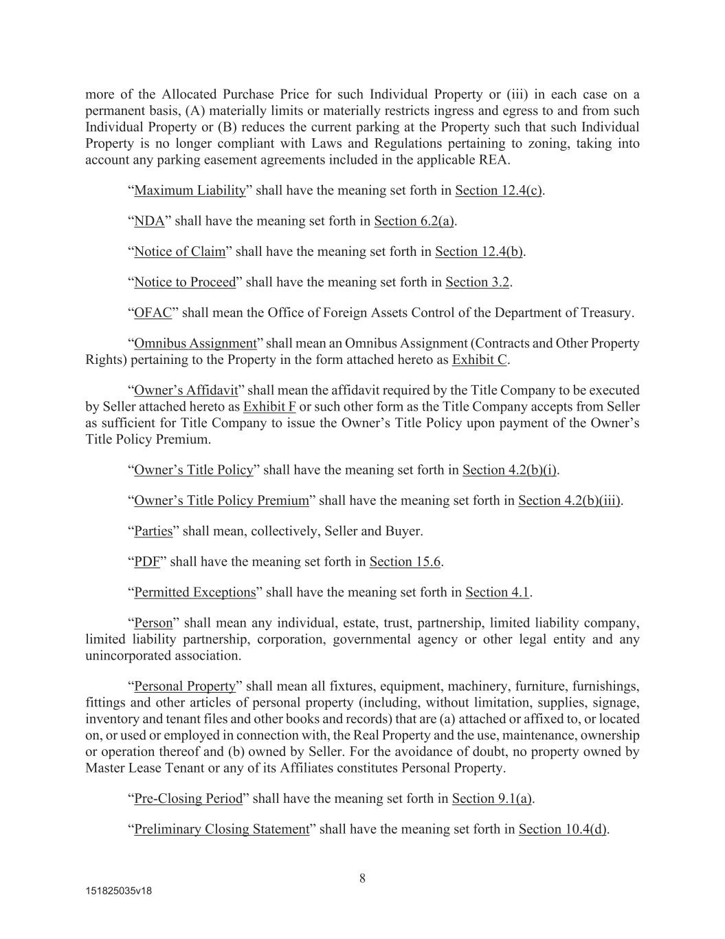 8 151825035v18 more of the Allocated Purchase Price for such Individual Property or (iii) in each case on a permanent basis, (A) materially limits or materially restricts ingress and egress to and from such Individual Property or (B) reduces the current parking at the Property such that such Individual Property is no longer compliant with Laws and Regulations pertaining to zoning, taking into account any parking easement agreements included in the applicable REA. “Maximum Liability” shall have the meaning set forth in Section 12.4(c). “NDA” shall have the meaning set forth in Section 6.2(a). “Notice of Claim” shall have the meaning set forth in Section 12.4(b). “Notice to Proceed” shall have the meaning set forth in Section 3.2. “OFAC” shall mean the Office of Foreign Assets Control of the Department of Treasury. “Omnibus Assignment” shall mean an Omnibus Assignment (Contracts and Other Property Rights) pertaining to the Property in the form attached hereto as Exhibit C. “Owner’s Affidavit” shall mean the affidavit required by the Title Company to be executed by Seller attached hereto as Exhibit F or such other form as the Title Company accepts from Seller as sufficient for Title Company to issue the Owner’s Title Policy upon payment of the Owner’s Title Policy Premium. “Owner’s Title Policy” shall have the meaning set forth in Section 4.2(b)(i). “Owner’s Title Policy Premium” shall have the meaning set forth in Section 4.2(b)(iii). “Parties” shall mean, collectively, Seller and Buyer. “PDF” shall have the meaning set forth in Section 15.6. “Permitted Exceptions” shall have the meaning set forth in Section 4.1. “Person” shall mean any individual, estate, trust, partnership, limited liability company, limited liability partnership, corporation, governmental agency or other legal entity and any unincorporated association. “Personal Property” shall mean all fixtures, equipment, machinery, furniture, furnishings, fittings and other articles of personal property (including, without limitation, supplies, signage, inventory and tenant files and other books and records) that are (a) attached or affixed to, or located on, or used or employed in connection with, the Real Property and the use, maintenance, ownership or operation thereof and (b) owned by Seller. For the avoidance of doubt, no property owned by Master Lease Tenant or any of its Affiliates constitutes Personal Property. “Pre-Closing Period” shall have the meaning set forth in Section 9.1(a). “Preliminary Closing Statement” shall have the meaning set forth in Section 10.4(d).