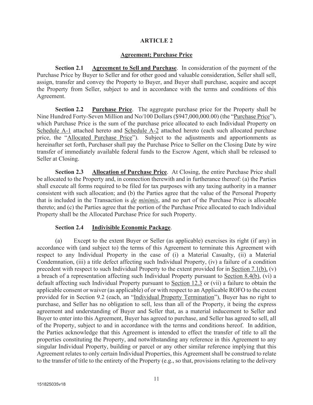 11 151825035v18 ARTICLE 2 Agreement; Purchase Price Section 2.1 Agreement to Sell and Purchase. In consideration of the payment of the Purchase Price by Buyer to Seller and for other good and valuable consideration, Seller shall sell, assign, transfer and convey the Property to Buyer, and Buyer shall purchase, acquire and accept the Property from Seller, subject to and in accordance with the terms and conditions of this Agreement. Section 2.2 Purchase Price. The aggregate purchase price for the Property shall be Nine Hundred Forty-Seven Million and No/100 Dollars ($947,000,000.00) (the “Purchase Price”), which Purchase Price is the sum of the purchase price allocated to each Individual Property on Schedule A-1 attached hereto and Schedule A-2 attached hereto (each such allocated purchase price, the “Allocated Purchase Price”). Subject to the adjustments and apportionments as hereinafter set forth, Purchaser shall pay the Purchase Price to Seller on the Closing Date by wire transfer of immediately available federal funds to the Escrow Agent, which shall be released to Seller at Closing. Section 2.3 Allocation of Purchase Price. At Closing, the entire Purchase Price shall be allocated to the Property and, in connection therewith and in furtherance thereof: (a) the Parties shall execute all forms required to be filed for tax purposes with any taxing authority in a manner consistent with such allocation; and (b) the Parties agree that the value of the Personal Property that is included in the Transaction is de minimis, and no part of the Purchase Price is allocable thereto; and (c) the Parties agree that the portion of the Purchase Price allocated to each Individual Property shall be the Allocated Purchase Price for such Property. Section 2.4 Indivisible Economic Package. (a) Except to the extent Buyer or Seller (as applicable) exercises its right (if any) in accordance with (and subject to) the terms of this Agreement to terminate this Agreement with respect to any Individual Property in the case of (i) a Material Casualty, (ii) a Material Condemnation, (iii) a title defect affecting such Individual Property, (iv) a failure of a condition precedent with respect to such Individual Property to the extent provided for in Section 7.1(b), (v) a breach of a representation affecting such Individual Property pursuant to Section 8.4(b), (vi) a default affecting such Individual Property pursuant to Section 12.3 or (vii) a failure to obtain the applicable consent or waiver (as applicable) of or with respect to an Applicable ROFO to the extent provided for in Section 9.2 (each, an “Individual Property Termination”), Buyer has no right to purchase, and Seller has no obligation to sell, less than all of the Property, it being the express agreement and understanding of Buyer and Seller that, as a material inducement to Seller and Buyer to enter into this Agreement, Buyer has agreed to purchase, and Seller has agreed to sell, all of the Property, subject to and in accordance with the terms and conditions hereof. In addition, the Parties acknowledge that this Agreement is intended to effect the transfer of title to all the properties constituting the Property, and notwithstanding any reference in this Agreement to any singular Individual Property, building or parcel or any other similar reference implying that this Agreement relates to only certain Individual Properties, this Agreement shall be construed to relate to the transfer of title to the entirety of the Property (e.g., so that, provisions relating to the delivery