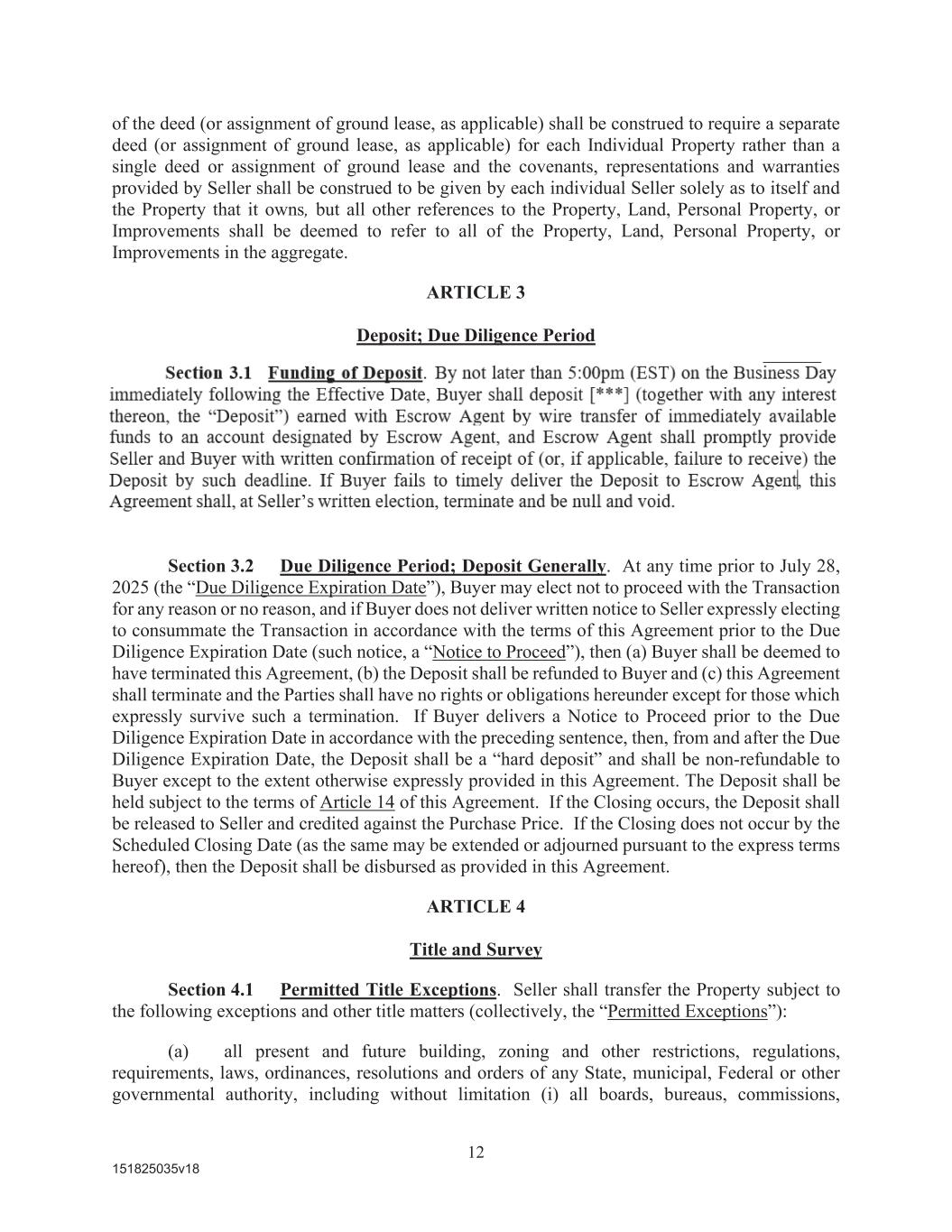 12 151825035v18 of the deed (or assignment of ground lease, as applicable) shall be construed to require a separate deed (or assignment of ground lease, as applicable) for each Individual Property rather than a single deed or assignment of ground lease and the covenants, representations and warranties provided by Seller shall be construed to be given by each individual Seller solely as to itself and the Property that it owns, but all other references to the Property, Land, Personal Property, or Improvements shall be deemed to refer to all of the Property, Land, Personal Property, or Improvements in the aggregate. ARTICLE 3 Deposit; Due Diligence Period Section 3.1 Funding of Deposit. By not later than 5:00pm (EST) on the Business Day immediately following the Effective Date, Buyer shall deposit (together with any interest earned thereon, the “Deposit”) with Escrow Agent by wire transfer of immediately available funds to an account designated by Escrow Agent, and Escrow Agent shall promptly provide Seller and Buyer with written confirmation of receipt of (or, if applicable, failure to receive) the Deposit by such deadline. If Buyer fails to timely deliver the Deposit to Escrow Agent, this Agreement shall, at Seller’s written election, terminate and be null and void. Section 3.2 Due Diligence Period; Deposit Generally. At any time prior to July 28, 2025 (the “Due Diligence Expiration Date”), Buyer may elect not to proceed with the Transaction for any reason or no reason, and if Buyer does not deliver written notice to Seller expressly electing to consummate the Transaction in accordance with the terms of this Agreement prior to the Due Diligence Expiration Date (such notice, a “Notice to Proceed”), then (a) Buyer shall be deemed to have terminated this Agreement, (b) the Deposit shall be refunded to Buyer and (c) this Agreement shall terminate and the Parties shall have no rights or obligations hereunder except for those which expressly survive such a termination. If Buyer delivers a Notice to Proceed prior to the Due Diligence Expiration Date in accordance with the preceding sentence, then, from and after the Due Diligence Expiration Date, the Deposit shall be a “hard deposit” and shall be non-refundable to Buyer except to the extent otherwise expressly provided in this Agreement. The Deposit shall be held subject to the terms of Article 14 of this Agreement. If the Closing occurs, the Deposit shall be released to Seller and credited against the Purchase Price. If the Closing does not occur by the Scheduled Closing Date (as the same may be extended or adjourned pursuant to the express terms hereof), then the Deposit shall be disbursed as provided in this Agreement. ARTICLE 4 Title and Survey Section 4.1 Permitted Title Exceptions. Seller shall transfer the Property subject to the following exceptions and other title matters (collectively, the “Permitted Exceptions”): (a) all present and future building, zoning and other restrictions, regulations, requirements, laws, ordinances, resolutions and orders of any State, municipal, Federal or other governmental authority, including without limitation (i) all boards, bureaus, commissions,