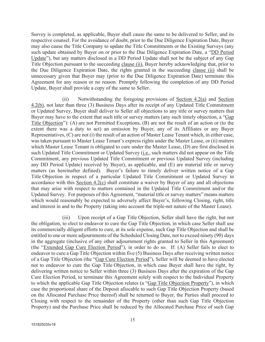 15 151825035v18 Survey is completed, as applicable, Buyer shall cause the same to be delivered to Seller, and its respective counsel. For the avoidance of doubt, prior to the Due Diligence Expiration Date, Buyer may also cause the Title Company to update the Title Commitments or the Existing Surveys (any such update obtained by Buyer on or prior to the Due Diligence Expiration Date, a “DD Period Update”), but any matters disclosed in a DD Period Update shall not be the subject of any Gap Title Objection pursuant to the succeeding clause (ii), Buyer hereby acknowledging that, prior to the Due Diligence Expiration Date, the rights granted in the succeeding clause (ii) shall be unnecessary given that Buyer may (prior to the Due Diligence Expiration Date) terminate this Agreement for any reason or no reason. Promptly following the completion of any DD Period Update, Buyer shall provide a copy of the same to Seller. (ii) Notwithstanding the foregoing provisions of Section 4.2(a) and Section 4.2(b), not later than three (3) Business Days after its receipt of any Updated Title Commitment or Updated Survey, Buyer shall deliver to Seller all objections to any title or survey matters that Buyer may have to the extent that such title or survey matters (any such timely objection, a “Gap Title Objection”): (A) are not Permitted Exceptions, (B) are not the result of an action or (to the extent there was a duty to act) an omission by Buyer, any of its Affiliates or any Buyer Representatives, (C) are not (i) the result of an action of Master Lease Tenant which, in either case, was taken pursuant to Master Lease Tenant’s express rights under the Master Lease, or (ii) matters which Master Lease Tenant is obligated to cure under the Master Lease, (D) are first disclosed in such Updated Title Commitment or Updated Survey (i.e., such matters did not appear on the Title Commitment, any previous Updated Title Commitment or previous Updated Survey (including any DD Period Update) received by Buyer), as applicable, and (E) are material title or survey matters (as hereinafter defined). Buyer’s failure to timely deliver written notice of a Gap Title Objection in respect of a particular Updated Title Commitment or Updated Survey in accordance with this Section 4.2(c) shall constitute a waiver by Buyer of any and all objections that may arise with respect to matters contained in the Updated Title Commitment and/or the Updated Survey. For purposes of this Agreement, “material title or survey matters” means matters which would reasonably be expected to adversely affect Buyer’s, following Closing, right, title and interest in and to the Property (taking into account the triple-net nature of the Master Lease). (iii) Upon receipt of a Gap Title Objection, Seller shall have the right, but not the obligation, to elect to endeavor to cure the Gap Title Objection, in which case Seller shall use its commercially diligent efforts to cure, at its sole expense, such Gap Title Objection and shall be entitled to one or more adjournments of the Scheduled Closing Date, not to exceed ninety (90) days in the aggregate (inclusive of any other adjournment rights granted to Seller in this Agreement) (the “Extended Gap Cure Election Period”), in order to do so. If: (A) Seller fails to elect to endeavor to cure a Gap Title Objection within five (5) Business Days after receiving written notice of a Gap Title Objection (the “Gap Cure Election Period”), Seller will be deemed to have elected not to endeavor to cure the Gap Title Objection, in which case Buyer shall have the right, by delivering written notice to Seller within three (3) Business Days after the expiration of the Gap Cure Election Period, to terminate this Agreement solely with respect to the Individual Property to which the applicable Gap Title Objection relates (a “Gap Title Objection Property”), in which case the proportional share of the Deposit allocable to such Gap Title Objection Property (based on the Allocated Purchase Price thereof) shall be returned to Buyer, the Parties shall proceed to Closing with respect to the remainder of the Property (other than such Gap Title Objection Property) and the Purchase Price shall be reduced by the Allocated Purchase Price of such Gap