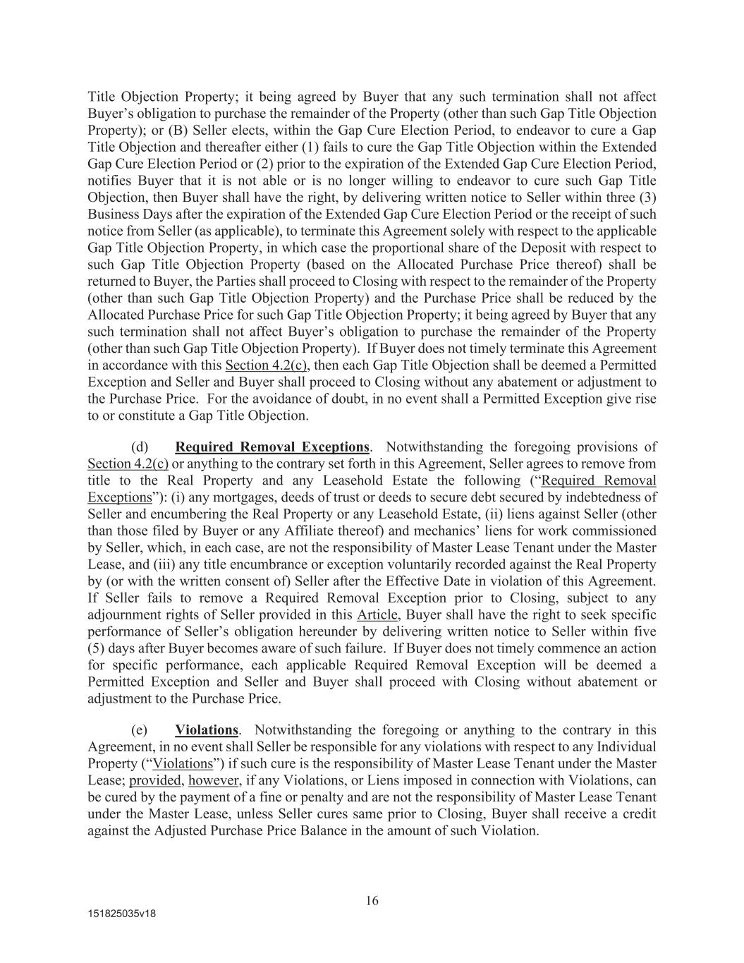 16 151825035v18 Title Objection Property; it being agreed by Buyer that any such termination shall not affect Buyer’s obligation to purchase the remainder of the Property (other than such Gap Title Objection Property); or (B) Seller elects, within the Gap Cure Election Period, to endeavor to cure a Gap Title Objection and thereafter either (1) fails to cure the Gap Title Objection within the Extended Gap Cure Election Period or (2) prior to the expiration of the Extended Gap Cure Election Period, notifies Buyer that it is not able or is no longer willing to endeavor to cure such Gap Title Objection, then Buyer shall have the right, by delivering written notice to Seller within three (3) Business Days after the expiration of the Extended Gap Cure Election Period or the receipt of such notice from Seller (as applicable), to terminate this Agreement solely with respect to the applicable Gap Title Objection Property, in which case the proportional share of the Deposit with respect to such Gap Title Objection Property (based on the Allocated Purchase Price thereof) shall be returned to Buyer, the Parties shall proceed to Closing with respect to the remainder of the Property (other than such Gap Title Objection Property) and the Purchase Price shall be reduced by the Allocated Purchase Price for such Gap Title Objection Property; it being agreed by Buyer that any such termination shall not affect Buyer’s obligation to purchase the remainder of the Property (other than such Gap Title Objection Property). If Buyer does not timely terminate this Agreement in accordance with this Section 4.2(c), then each Gap Title Objection shall be deemed a Permitted Exception and Seller and Buyer shall proceed to Closing without any abatement or adjustment to the Purchase Price. For the avoidance of doubt, in no event shall a Permitted Exception give rise to or constitute a Gap Title Objection. (d) Required Removal Exceptions. Notwithstanding the foregoing provisions of Section 4.2(c) or anything to the contrary set forth in this Agreement, Seller agrees to remove from title to the Real Property and any Leasehold Estate the following (“Required Removal Exceptions”): (i) any mortgages, deeds of trust or deeds to secure debt secured by indebtedness of Seller and encumbering the Real Property or any Leasehold Estate, (ii) liens against Seller (other than those filed by Buyer or any Affiliate thereof) and mechanics’ liens for work commissioned by Seller, which, in each case, are not the responsibility of Master Lease Tenant under the Master Lease, and (iii) any title encumbrance or exception voluntarily recorded against the Real Property by (or with the written consent of) Seller after the Effective Date in violation of this Agreement. If Seller fails to remove a Required Removal Exception prior to Closing, subject to any adjournment rights of Seller provided in this Article, Buyer shall have the right to seek specific performance of Seller’s obligation hereunder by delivering written notice to Seller within five (5) days after Buyer becomes aware of such failure. If Buyer does not timely commence an action for specific performance, each applicable Required Removal Exception will be deemed a Permitted Exception and Seller and Buyer shall proceed with Closing without abatement or adjustment to the Purchase Price. (e) Violations. Notwithstanding the foregoing or anything to the contrary in this Agreement, in no event shall Seller be responsible for any violations with respect to any Individual Property (“Violations”) if such cure is the responsibility of Master Lease Tenant under the Master Lease; provided, however, if any Violations, or Liens imposed in connection with Violations, can be cured by the payment of a fine or penalty and are not the responsibility of Master Lease Tenant under the Master Lease, unless Seller cures same prior to Closing, Buyer shall receive a credit against the Adjusted Purchase Price Balance in the amount of such Violation.