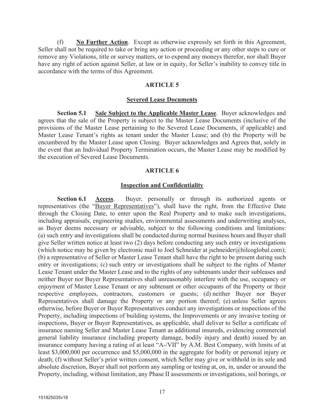17 151825035v18 (f) No Further Action. Except as otherwise expressly set forth in this Agreement, Seller shall not be required to take or bring any action or proceeding or any other steps to cure or remove any Violations, title or survey matters, or to expend any moneys therefor, nor shall Buyer have any right of action against Seller, at law or in equity, for Seller’s inability to convey title in accordance with the terms of this Agreement. ARTICLE 5 Severed Lease Documents Section 5.1 Sale Subject to the Applicable Master Lease. Buyer acknowledges and agrees that the sale of the Property is subject to the Master Lease Documents (inclusive of the provisions of the Master Lease pertaining to the Severed Lease Documents, if applicable) and Master Lease Tenant’s rights as tenant under the Master Lease; and (b) the Property will be encumbered by the Master Lease upon Closing. Buyer acknowledges and Agrees that, solely in the event that an Individual Property Termination occurs, the Master Lease may be modified by the execution of Severed Lease Documents. ARTICLE 6 Inspection and Confidentiality Section 6.1 Access. Buyer, personally or through its authorized agents or representatives (the “Buyer Representatives”), shall have the right, from the Effective Date through the Closing Date, to enter upon the Real Property and to make such investigations, including appraisals, engineering studies, environmental assessments and underwriting analyses, as Buyer deems necessary or advisable, subject to the following conditions and limitations: (a) such entry and investigations shall be conducted during normal business hours and Buyer shall give Seller written notice at least two (2) days before conducting any such entry or investigations (which notice may be given by electronic mail to Joel Schneider at jschneider@hilcoglobal.com); (b) a representative of Seller or Master Lease Tenant shall have the right to be present during such entry or investigations; (c) such entry or investigations shall be subject to the rights of Master Lease Tenant under the Master Lease and to the rights of any subtenants under their subleases and neither Buyer nor Buyer Representatives shall unreasonably interfere with the use, occupancy or enjoyment of Master Lease Tenant or any subtenant or other occupants of the Property or their respective employees, contractors, customers or guests; (d) neither Buyer nor Buyer Representatives shall damage the Property or any portion thereof; (e) unless Seller agrees otherwise, before Buyer or Buyer Representatives conduct any investigations or inspections of the Property, including inspections of building systems, the Improvements or any invasive testing or inspections, Buyer or Buyer Representatives, as applicable, shall deliver to Seller a certificate of insurance naming Seller and Master Lease Tenant as additional insureds, evidencing commercial general liability insurance (including property damage, bodily injury and death) issued by an insurance company having a rating of at least “A-/VII” by A.M. Best Company, with limits of at least $3,000,000 per occurrence and $5,000,000 in the aggregate for bodily or personal injury or death; (f) without Seller’s prior written consent, which Seller may give or withhold in its sole and absolute discretion, Buyer shall not perform any sampling or testing at, on, in, under or around the Property, including, without limitation, any Phase II assessments or investigations, soil borings, or