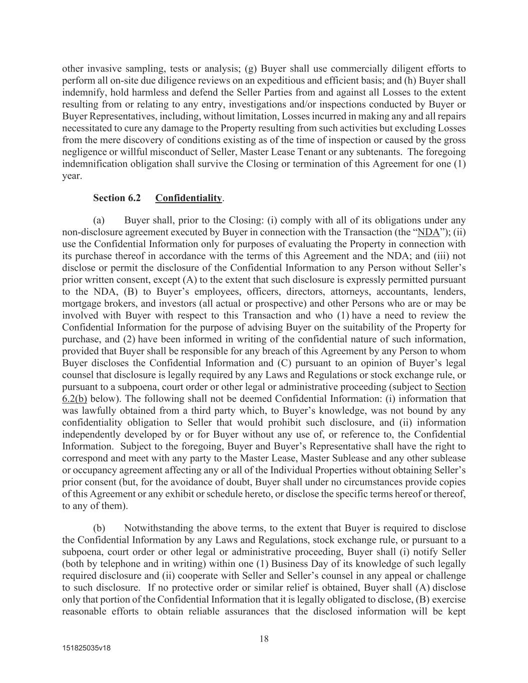 18 151825035v18 other invasive sampling, tests or analysis; (g) Buyer shall use commercially diligent efforts to perform all on-site due diligence reviews on an expeditious and efficient basis; and (h) Buyer shall indemnify, hold harmless and defend the Seller Parties from and against all Losses to the extent resulting from or relating to any entry, investigations and/or inspections conducted by Buyer or Buyer Representatives, including, without limitation, Losses incurred in making any and all repairs necessitated to cure any damage to the Property resulting from such activities but excluding Losses from the mere discovery of conditions existing as of the time of inspection or caused by the gross negligence or willful misconduct of Seller, Master Lease Tenant or any subtenants. The foregoing indemnification obligation shall survive the Closing or termination of this Agreement for one (1) year. Section 6.2 Confidentiality. (a) Buyer shall, prior to the Closing: (i) comply with all of its obligations under any non-disclosure agreement executed by Buyer in connection with the Transaction (the “NDA”); (ii) use the Confidential Information only for purposes of evaluating the Property in connection with its purchase thereof in accordance with the terms of this Agreement and the NDA; and (iii) not disclose or permit the disclosure of the Confidential Information to any Person without Seller’s prior written consent, except (A) to the extent that such disclosure is expressly permitted pursuant to the NDA, (B) to Buyer’s employees, officers, directors, attorneys, accountants, lenders, mortgage brokers, and investors (all actual or prospective) and other Persons who are or may be involved with Buyer with respect to this Transaction and who (1) have a need to review the Confidential Information for the purpose of advising Buyer on the suitability of the Property for purchase, and (2) have been informed in writing of the confidential nature of such information, provided that Buyer shall be responsible for any breach of this Agreement by any Person to whom Buyer discloses the Confidential Information and (C) pursuant to an opinion of Buyer’s legal counsel that disclosure is legally required by any Laws and Regulations or stock exchange rule, or pursuant to a subpoena, court order or other legal or administrative proceeding (subject to Section 6.2(b) below). The following shall not be deemed Confidential Information: (i) information that was lawfully obtained from a third party which, to Buyer’s knowledge, was not bound by any confidentiality obligation to Seller that would prohibit such disclosure, and (ii) information independently developed by or for Buyer without any use of, or reference to, the Confidential Information. Subject to the foregoing, Buyer and Buyer’s Representative shall have the right to correspond and meet with any party to the Master Lease, Master Sublease and any other sublease or occupancy agreement affecting any or all of the Individual Properties without obtaining Seller’s prior consent (but, for the avoidance of doubt, Buyer shall under no circumstances provide copies of this Agreement or any exhibit or schedule hereto, or disclose the specific terms hereof or thereof, to any of them). (b) Notwithstanding the above terms, to the extent that Buyer is required to disclose the Confidential Information by any Laws and Regulations, stock exchange rule, or pursuant to a subpoena, court order or other legal or administrative proceeding, Buyer shall (i) notify Seller (both by telephone and in writing) within one (1) Business Day of its knowledge of such legally required disclosure and (ii) cooperate with Seller and Seller’s counsel in any appeal or challenge to such disclosure. If no protective order or similar relief is obtained, Buyer shall (A) disclose only that portion of the Confidential Information that it is legally obligated to disclose, (B) exercise reasonable efforts to obtain reliable assurances that the disclosed information will be kept