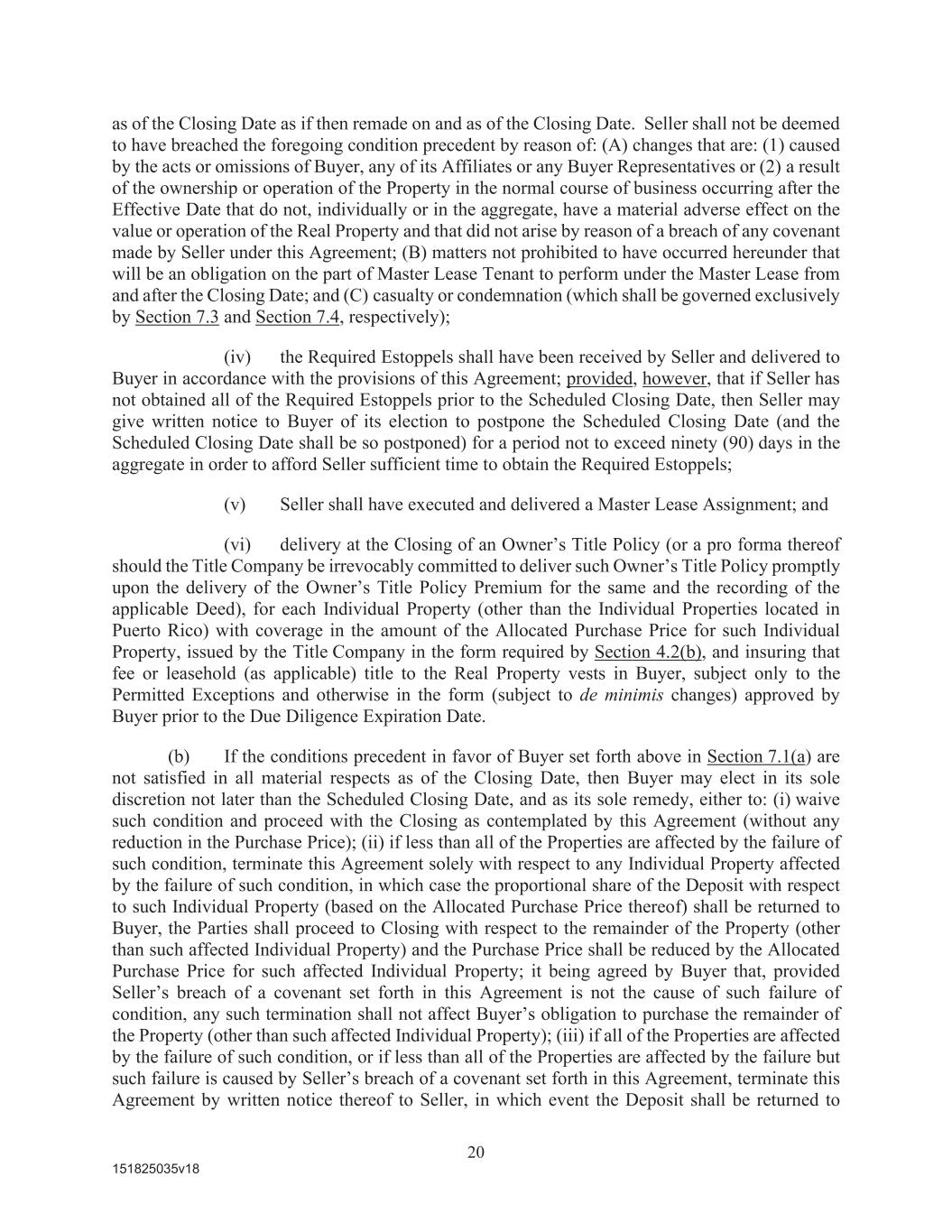 20 151825035v18 as of the Closing Date as if then remade on and as of the Closing Date. Seller shall not be deemed to have breached the foregoing condition precedent by reason of: (A) changes that are: (1) caused by the acts or omissions of Buyer, any of its Affiliates or any Buyer Representatives or (2) a result of the ownership or operation of the Property in the normal course of business occurring after the Effective Date that do not, individually or in the aggregate, have a material adverse effect on the value or operation of the Real Property and that did not arise by reason of a breach of any covenant made by Seller under this Agreement; (B) matters not prohibited to have occurred hereunder that will be an obligation on the part of Master Lease Tenant to perform under the Master Lease from and after the Closing Date; and (C) casualty or condemnation (which shall be governed exclusively by Section 7.3 and Section 7.4, respectively); (iv) the Required Estoppels shall have been received by Seller and delivered to Buyer in accordance with the provisions of this Agreement; provided, however, that if Seller has not obtained all of the Required Estoppels prior to the Scheduled Closing Date, then Seller may give written notice to Buyer of its election to postpone the Scheduled Closing Date (and the Scheduled Closing Date shall be so postponed) for a period not to exceed ninety (90) days in the aggregate in order to afford Seller sufficient time to obtain the Required Estoppels; (v) Seller shall have executed and delivered a Master Lease Assignment; and (vi) delivery at the Closing of an Owner’s Title Policy (or a pro forma thereof should the Title Company be irrevocably committed to deliver such Owner’s Title Policy promptly upon the delivery of the Owner’s Title Policy Premium for the same and the recording of the applicable Deed), for each Individual Property (other than the Individual Properties located in Puerto Rico) with coverage in the amount of the Allocated Purchase Price for such Individual Property, issued by the Title Company in the form required by Section 4.2(b), and insuring that fee or leasehold (as applicable) title to the Real Property vests in Buyer, subject only to the Permitted Exceptions and otherwise in the form (subject to de minimis changes) approved by Buyer prior to the Due Diligence Expiration Date. (b) If the conditions precedent in favor of Buyer set forth above in Section 7.1(a) are not satisfied in all material respects as of the Closing Date, then Buyer may elect in its sole discretion not later than the Scheduled Closing Date, and as its sole remedy, either to: (i) waive such condition and proceed with the Closing as contemplated by this Agreement (without any reduction in the Purchase Price); (ii) if less than all of the Properties are affected by the failure of such condition, terminate this Agreement solely with respect to any Individual Property affected by the failure of such condition, in which case the proportional share of the Deposit with respect to such Individual Property (based on the Allocated Purchase Price thereof) shall be returned to Buyer, the Parties shall proceed to Closing with respect to the remainder of the Property (other than such affected Individual Property) and the Purchase Price shall be reduced by the Allocated Purchase Price for such affected Individual Property; it being agreed by Buyer that, provided Seller’s breach of a covenant set forth in this Agreement is not the cause of such failure of condition, any such termination shall not affect Buyer’s obligation to purchase the remainder of the Property (other than such affected Individual Property); (iii) if all of the Properties are affected by the failure of such condition, or if less than all of the Properties are affected by the failure but such failure is caused by Seller’s breach of a covenant set forth in this Agreement, terminate this Agreement by written notice thereof to Seller, in which event the Deposit shall be returned to