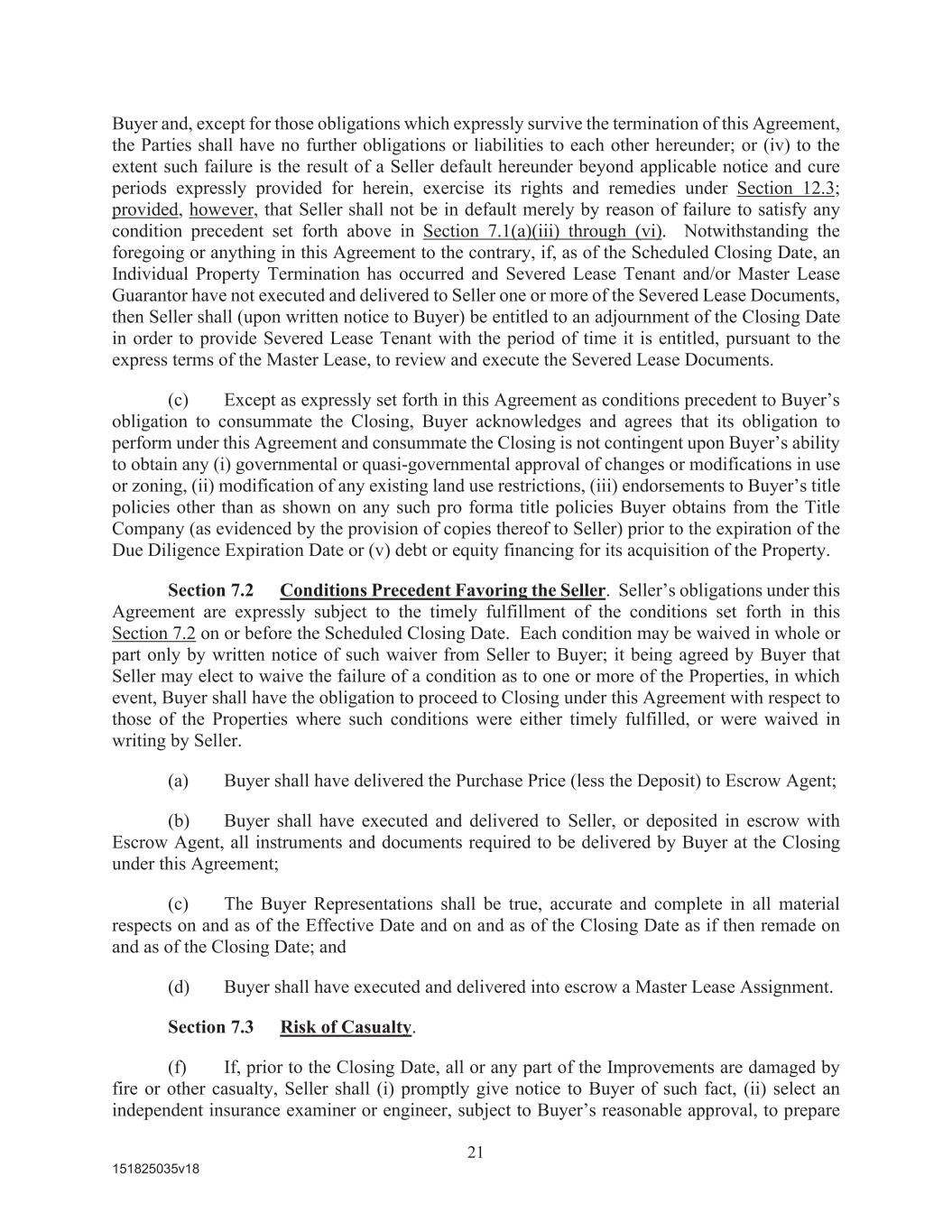 21 151825035v18 Buyer and, except for those obligations which expressly survive the termination of this Agreement, the Parties shall have no further obligations or liabilities to each other hereunder; or (iv) to the extent such failure is the result of a Seller default hereunder beyond applicable notice and cure periods expressly provided for herein, exercise its rights and remedies under Section 12.3; provided, however, that Seller shall not be in default merely by reason of failure to satisfy any condition precedent set forth above in Section 7.1(a)(iii) through (vi). Notwithstanding the foregoing or anything in this Agreement to the contrary, if, as of the Scheduled Closing Date, an Individual Property Termination has occurred and Severed Lease Tenant and/or Master Lease Guarantor have not executed and delivered to Seller one or more of the Severed Lease Documents, then Seller shall (upon written notice to Buyer) be entitled to an adjournment of the Closing Date in order to provide Severed Lease Tenant with the period of time it is entitled, pursuant to the express terms of the Master Lease, to review and execute the Severed Lease Documents. (c) Except as expressly set forth in this Agreement as conditions precedent to Buyer’s obligation to consummate the Closing, Buyer acknowledges and agrees that its obligation to perform under this Agreement and consummate the Closing is not contingent upon Buyer’s ability to obtain any (i) governmental or quasi-governmental approval of changes or modifications in use or zoning, (ii) modification of any existing land use restrictions, (iii) endorsements to Buyer’s title policies other than as shown on any such pro forma title policies Buyer obtains from the Title Company (as evidenced by the provision of copies thereof to Seller) prior to the expiration of the Due Diligence Expiration Date or (v) debt or equity financing for its acquisition of the Property. Section 7.2 Conditions Precedent Favoring the Seller. Seller’s obligations under this Agreement are expressly subject to the timely fulfillment of the conditions set forth in this Section 7.2 on or before the Scheduled Closing Date. Each condition may be waived in whole or part only by written notice of such waiver from Seller to Buyer; it being agreed by Buyer that Seller may elect to waive the failure of a condition as to one or more of the Properties, in which event, Buyer shall have the obligation to proceed to Closing under this Agreement with respect to those of the Properties where such conditions were either timely fulfilled, or were waived in writing by Seller. (a) Buyer shall have delivered the Purchase Price (less the Deposit) to Escrow Agent; (b) Buyer shall have executed and delivered to Seller, or deposited in escrow with Escrow Agent, all instruments and documents required to be delivered by Buyer at the Closing under this Agreement; (c) The Buyer Representations shall be true, accurate and complete in all material respects on and as of the Effective Date and on and as of the Closing Date as if then remade on and as of the Closing Date; and (d) Buyer shall have executed and delivered into escrow a Master Lease Assignment. Section 7.3 Risk of Casualty. (f) If, prior to the Closing Date, all or any part of the Improvements are damaged by fire or other casualty, Seller shall (i) promptly give notice to Buyer of such fact, (ii) select an independent insurance examiner or engineer, subject to Buyer’s reasonable approval, to prepare