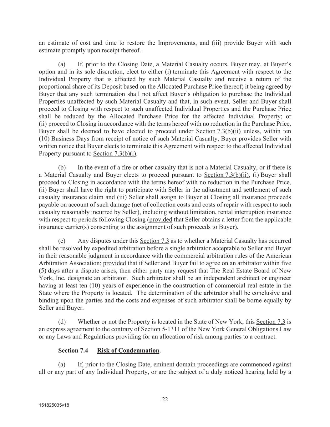 22 151825035v18 an estimate of cost and time to restore the Improvements, and (iii) provide Buyer with such estimate promptly upon receipt thereof. (a) If, prior to the Closing Date, a Material Casualty occurs, Buyer may, at Buyer’s option and in its sole discretion, elect to either (i) terminate this Agreement with respect to the Individual Property that is affected by such Material Casualty and receive a return of the proportional share of its Deposit based on the Allocated Purchase Price thereof; it being agreed by Buyer that any such termination shall not affect Buyer’s obligation to purchase the Individual Properties unaffected by such Material Casualty and that, in such event, Seller and Buyer shall proceed to Closing with respect to such unaffected Individual Properties and the Purchase Price shall be reduced by the Allocated Purchase Price for the affected Individual Property; or (ii) proceed to Closing in accordance with the terms hereof with no reduction in the Purchase Price. Buyer shall be deemed to have elected to proceed under Section 7.3(b)(ii) unless, within ten (10) Business Days from receipt of notice of such Material Casualty, Buyer provides Seller with written notice that Buyer elects to terminate this Agreement with respect to the affected Individual Property pursuant to Section 7.3(b)(i). (b) In the event of a fire or other casualty that is not a Material Casualty, or if there is a Material Casualty and Buyer elects to proceed pursuant to Section 7.3(b)(ii), (i) Buyer shall proceed to Closing in accordance with the terms hereof with no reduction in the Purchase Price, (ii) Buyer shall have the right to participate with Seller in the adjustment and settlement of such casualty insurance claim and (iii) Seller shall assign to Buyer at Closing all insurance proceeds payable on account of such damage (net of collection costs and costs of repair with respect to such casualty reasonably incurred by Seller), including without limitation, rental interruption insurance with respect to periods following Closing (provided that Seller obtains a letter from the applicable insurance carrier(s) consenting to the assignment of such proceeds to Buyer). (c) Any disputes under this Section 7.3 as to whether a Material Casualty has occurred shall be resolved by expedited arbitration before a single arbitrator acceptable to Seller and Buyer in their reasonable judgment in accordance with the commercial arbitration rules of the American Arbitration Association; provided that if Seller and Buyer fail to agree on an arbitrator within five (5) days after a dispute arises, then either party may request that The Real Estate Board of New York, Inc. designate an arbitrator. Such arbitrator shall be an independent architect or engineer having at least ten (10) years of experience in the construction of commercial real estate in the State where the Property is located. The determination of the arbitrator shall be conclusive and binding upon the parties and the costs and expenses of such arbitrator shall be borne equally by Seller and Buyer. (d) Whether or not the Property is located in the State of New York, this Section 7.3 is an express agreement to the contrary of Section 5-1311 of the New York General Obligations Law or any Laws and Regulations providing for an allocation of risk among parties to a contract. Section 7.4 Risk of Condemnation. (a) If, prior to the Closing Date, eminent domain proceedings are commenced against all or any part of any Individual Property, or are the subject of a duly noticed hearing held by a