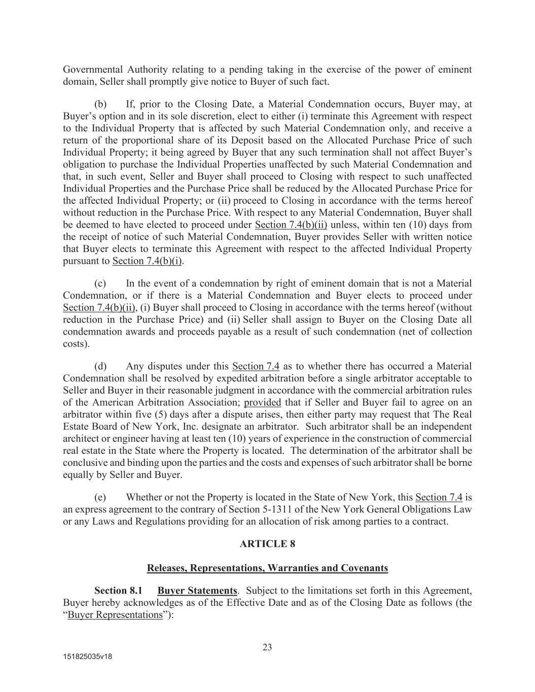 23 151825035v18 Governmental Authority relating to a pending taking in the exercise of the power of eminent domain, Seller shall promptly give notice to Buyer of such fact. (b) If, prior to the Closing Date, a Material Condemnation occurs, Buyer may, at Buyer’s option and in its sole discretion, elect to either (i) terminate this Agreement with respect to the Individual Property that is affected by such Material Condemnation only, and receive a return of the proportional share of its Deposit based on the Allocated Purchase Price of such Individual Property; it being agreed by Buyer that any such termination shall not affect Buyer’s obligation to purchase the Individual Properties unaffected by such Material Condemnation and that, in such event, Seller and Buyer shall proceed to Closing with respect to such unaffected Individual Properties and the Purchase Price shall be reduced by the Allocated Purchase Price for the affected Individual Property; or (ii) proceed to Closing in accordance with the terms hereof without reduction in the Purchase Price. With respect to any Material Condemnation, Buyer shall be deemed to have elected to proceed under Section 7.4(b)(ii) unless, within ten (10) days from the receipt of notice of such Material Condemnation, Buyer provides Seller with written notice that Buyer elects to terminate this Agreement with respect to the affected Individual Property pursuant to Section 7.4(b)(i). (c) In the event of a condemnation by right of eminent domain that is not a Material Condemnation, or if there is a Material Condemnation and Buyer elects to proceed under Section 7.4(b)(ii), (i) Buyer shall proceed to Closing in accordance with the terms hereof (without reduction in the Purchase Price) and (ii) Seller shall assign to Buyer on the Closing Date all condemnation awards and proceeds payable as a result of such condemnation (net of collection costs). (d) Any disputes under this Section 7.4 as to whether there has occurred a Material Condemnation shall be resolved by expedited arbitration before a single arbitrator acceptable to Seller and Buyer in their reasonable judgment in accordance with the commercial arbitration rules of the American Arbitration Association; provided that if Seller and Buyer fail to agree on an arbitrator within five (5) days after a dispute arises, then either party may request that The Real Estate Board of New York, Inc. designate an arbitrator. Such arbitrator shall be an independent architect or engineer having at least ten (10) years of experience in the construction of commercial real estate in the State where the Property is located. The determination of the arbitrator shall be conclusive and binding upon the parties and the costs and expenses of such arbitrator shall be borne equally by Seller and Buyer. (e) Whether or not the Property is located in the State of New York, this Section 7.4 is an express agreement to the contrary of Section 5-1311 of the New York General Obligations Law or any Laws and Regulations providing for an allocation of risk among parties to a contract. ARTICLE 8 Releases, Representations, Warranties and Covenants Section 8.1 Buyer Statements. Subject to the limitations set forth in this Agreement, Buyer hereby acknowledges as of the Effective Date and as of the Closing Date as follows (the “Buyer Representations”):