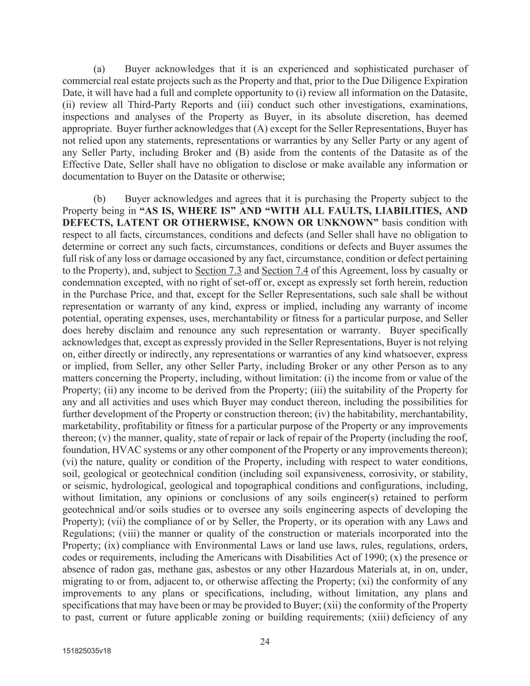 24 151825035v18 (a) Buyer acknowledges that it is an experienced and sophisticated purchaser of commercial real estate projects such as the Property and that, prior to the Due Diligence Expiration Date, it will have had a full and complete opportunity to (i) review all information on the Datasite, (ii) review all Third-Party Reports and (iii) conduct such other investigations, examinations, inspections and analyses of the Property as Buyer, in its absolute discretion, has deemed appropriate. Buyer further acknowledges that (A) except for the Seller Representations, Buyer has not relied upon any statements, representations or warranties by any Seller Party or any agent of any Seller Party, including Broker and (B) aside from the contents of the Datasite as of the Effective Date, Seller shall have no obligation to disclose or make available any information or documentation to Buyer on the Datasite or otherwise; (b) Buyer acknowledges and agrees that it is purchasing the Property subject to the Property being in “AS IS, WHERE IS” AND “WITH ALL FAULTS, LIABILITIES, AND DEFECTS, LATENT OR OTHERWISE, KNOWN OR UNKNOWN” basis condition with respect to all facts, circumstances, conditions and defects (and Seller shall have no obligation to determine or correct any such facts, circumstances, conditions or defects and Buyer assumes the full risk of any loss or damage occasioned by any fact, circumstance, condition or defect pertaining to the Property), and, subject to Section 7.3 and Section 7.4 of this Agreement, loss by casualty or condemnation excepted, with no right of set-off or, except as expressly set forth herein, reduction in the Purchase Price, and that, except for the Seller Representations, such sale shall be without representation or warranty of any kind, express or implied, including any warranty of income potential, operating expenses, uses, merchantability or fitness for a particular purpose, and Seller does hereby disclaim and renounce any such representation or warranty. Buyer specifically acknowledges that, except as expressly provided in the Seller Representations, Buyer is not relying on, either directly or indirectly, any representations or warranties of any kind whatsoever, express or implied, from Seller, any other Seller Party, including Broker or any other Person as to any matters concerning the Property, including, without limitation: (i) the income from or value of the Property; (ii) any income to be derived from the Property; (iii) the suitability of the Property for any and all activities and uses which Buyer may conduct thereon, including the possibilities for further development of the Property or construction thereon; (iv) the habitability, merchantability, marketability, profitability or fitness for a particular purpose of the Property or any improvements thereon; (v) the manner, quality, state of repair or lack of repair of the Property (including the roof, foundation, HVAC systems or any other component of the Property or any improvements thereon); (vi) the nature, quality or condition of the Property, including with respect to water conditions, soil, geological or geotechnical condition (including soil expansiveness, corrosivity, or stability, or seismic, hydrological, geological and topographical conditions and configurations, including, without limitation, any opinions or conclusions of any soils engineer(s) retained to perform geotechnical and/or soils studies or to oversee any soils engineering aspects of developing the Property); (vii) the compliance of or by Seller, the Property, or its operation with any Laws and Regulations; (viii) the manner or quality of the construction or materials incorporated into the Property; (ix) compliance with Environmental Laws or land use laws, rules, regulations, orders, codes or requirements, including the Americans with Disabilities Act of 1990; (x) the presence or absence of radon gas, methane gas, asbestos or any other Hazardous Materials at, in on, under, migrating to or from, adjacent to, or otherwise affecting the Property; (xi) the conformity of any improvements to any plans or specifications, including, without limitation, any plans and specifications that may have been or may be provided to Buyer; (xii) the conformity of the Property to past, current or future applicable zoning or building requirements; (xiii) deficiency of any