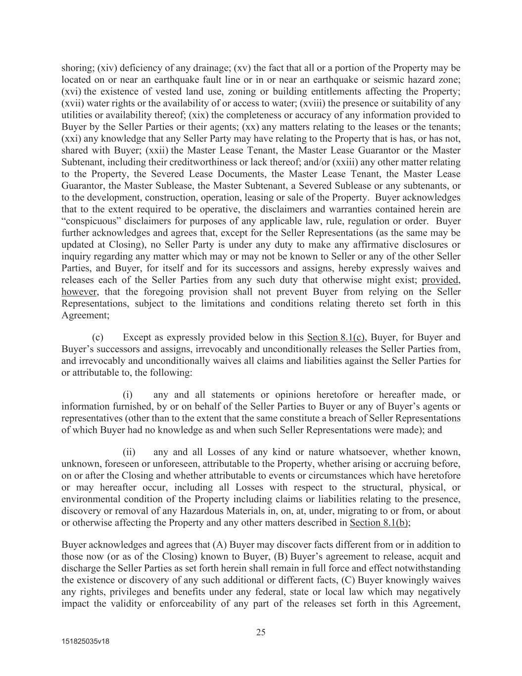 25 151825035v18 shoring; (xiv) deficiency of any drainage; (xv) the fact that all or a portion of the Property may be located on or near an earthquake fault line or in or near an earthquake or seismic hazard zone; (xvi) the existence of vested land use, zoning or building entitlements affecting the Property; (xvii) water rights or the availability of or access to water; (xviii) the presence or suitability of any utilities or availability thereof; (xix) the completeness or accuracy of any information provided to Buyer by the Seller Parties or their agents; (xx) any matters relating to the leases or the tenants; (xxi) any knowledge that any Seller Party may have relating to the Property that is has, or has not, shared with Buyer; (xxii) the Master Lease Tenant, the Master Lease Guarantor or the Master Subtenant, including their creditworthiness or lack thereof; and/or (xxiii) any other matter relating to the Property, the Severed Lease Documents, the Master Lease Tenant, the Master Lease Guarantor, the Master Sublease, the Master Subtenant, a Severed Sublease or any subtenants, or to the development, construction, operation, leasing or sale of the Property. Buyer acknowledges that to the extent required to be operative, the disclaimers and warranties contained herein are “conspicuous” disclaimers for purposes of any applicable law, rule, regulation or order. Buyer further acknowledges and agrees that, except for the Seller Representations (as the same may be updated at Closing), no Seller Party is under any duty to make any affirmative disclosures or inquiry regarding any matter which may or may not be known to Seller or any of the other Seller Parties, and Buyer, for itself and for its successors and assigns, hereby expressly waives and releases each of the Seller Parties from any such duty that otherwise might exist; provided, however, that the foregoing provision shall not prevent Buyer from relying on the Seller Representations, subject to the limitations and conditions relating thereto set forth in this Agreement; (c) Except as expressly provided below in this Section 8.1(c), Buyer, for Buyer and Buyer’s successors and assigns, irrevocably and unconditionally releases the Seller Parties from, and irrevocably and unconditionally waives all claims and liabilities against the Seller Parties for or attributable to, the following: (i) any and all statements or opinions heretofore or hereafter made, or information furnished, by or on behalf of the Seller Parties to Buyer or any of Buyer’s agents or representatives (other than to the extent that the same constitute a breach of Seller Representations of which Buyer had no knowledge as and when such Seller Representations were made); and (ii) any and all Losses of any kind or nature whatsoever, whether known, unknown, foreseen or unforeseen, attributable to the Property, whether arising or accruing before, on or after the Closing and whether attributable to events or circumstances which have heretofore or may hereafter occur, including all Losses with respect to the structural, physical, or environmental condition of the Property including claims or liabilities relating to the presence, discovery or removal of any Hazardous Materials in, on, at, under, migrating to or from, or about or otherwise affecting the Property and any other matters described in Section 8.1(b); Buyer acknowledges and agrees that (A) Buyer may discover facts different from or in addition to those now (or as of the Closing) known to Buyer, (B) Buyer’s agreement to release, acquit and discharge the Seller Parties as set forth herein shall remain in full force and effect notwithstanding the existence or discovery of any such additional or different facts, (C) Buyer knowingly waives any rights, privileges and benefits under any federal, state or local law which may negatively impact the validity or enforceability of any part of the releases set forth in this Agreement,