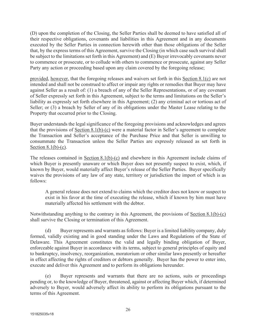 26 151825035v18 (D) upon the completion of the Closing, the Seller Parties shall be deemed to have satisfied all of their respective obligations, covenants and liabilities in this Agreement and in any documents executed by the Seller Parties in connection herewith other than those obligations of the Seller that, by the express terms of this Agreement, survive the Closing (in which case such survival shall be subject to the limitations set forth in this Agreement) and (E) Buyer irrevocably covenants never to commence or prosecute, or to collude with others to commence or prosecute, against any Seller Party any action or proceeding based upon any claim covered by the foregoing release; provided, however, that the foregoing releases and waivers set forth in this Section 8.1(c) are not intended and shall not be construed to affect or impair any rights or remedies that Buyer may have against Seller as a result of: (1) a breach of any of the Seller Representations, or of any covenant of Seller expressly set forth in this Agreement, subject to the terms and limitations on the Seller’s liability as expressly set forth elsewhere in this Agreement; (2) any criminal act or tortious act of Seller; or (3) a breach by Seller of any of its obligations under the Master Lease relating to the Property that occurred prior to the Closing. Buyer understands the legal significance of the foregoing provisions and acknowledges and agrees that the provisions of Section 8.1(b)-(c) were a material factor in Seller’s agreement to complete the Transaction and Seller’s acceptance of the Purchase Price and that Seller is unwilling to consummate the Transaction unless the Seller Parties are expressly released as set forth in Section 8.1(b)-(c). The releases contained in Section 8.1(b)-(c) and elsewhere in this Agreement include claims of which Buyer is presently unaware or which Buyer does not presently suspect to exist, which, if known by Buyer, would materially affect Buyer’s release of the Seller Parties. Buyer specifically waives the provisions of any law of any state, territory or jurisdiction the import of which is as follows: A general release does not extend to claims which the creditor does not know or suspect to exist in his favor at the time of executing the release, which if known by him must have materially affected his settlement with the debtor. Notwithstanding anything to the contrary in this Agreement, the provisions of Section 8.1(b)-(c) shall survive the Closing or termination of this Agreement. (d) Buyer represents and warrants as follows: Buyer is a limited liability company, duly formed, validly existing and in good standing under the Laws and Regulations of the State of Delaware. This Agreement constitutes the valid and legally binding obligation of Buyer, enforceable against Buyer in accordance with its terms, subject to general principles of equity and to bankruptcy, insolvency, reorganization, moratorium or other similar laws presently or hereafter in effect affecting the rights of creditors or debtors generally. Buyer has the power to enter into, execute and deliver this Agreement and to perform its obligations hereunder. (e) Buyer represents and warrants that there are no actions, suits or proceedings pending or, to the knowledge of Buyer, threatened, against or affecting Buyer which, if determined adversely to Buyer, would adversely affect its ability to perform its obligations pursuant to the terms of this Agreement.