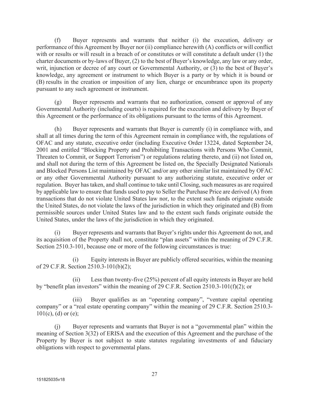 27 151825035v18 (f) Buyer represents and warrants that neither (i) the execution, delivery or performance of this Agreement by Buyer nor (ii) compliance herewith (A) conflicts or will conflict with or results or will result in a breach of or constitutes or will constitute a default under (1) the charter documents or by-laws of Buyer, (2) to the best of Buyer’s knowledge, any law or any order, writ, injunction or decree of any court or Governmental Authority, or (3) to the best of Buyer’s knowledge, any agreement or instrument to which Buyer is a party or by which it is bound or (B) results in the creation or imposition of any lien, charge or encumbrance upon its property pursuant to any such agreement or instrument. (g) Buyer represents and warrants that no authorization, consent or approval of any Governmental Authority (including courts) is required for the execution and delivery by Buyer of this Agreement or the performance of its obligations pursuant to the terms of this Agreement. (h) Buyer represents and warrants that Buyer is currently (i) in compliance with, and shall at all times during the term of this Agreement remain in compliance with, the regulations of OFAC and any statute, executive order (including Executive Order 13224, dated September 24, 2001 and entitled “Blocking Property and Prohibiting Transactions with Persons Who Commit, Threaten to Commit, or Support Terrorism”) or regulations relating thereto, and (ii) not listed on, and shall not during the term of this Agreement be listed on, the Specially Designated Nationals and Blocked Persons List maintained by OFAC and/or any other similar list maintained by OFAC or any other Governmental Authority pursuant to any authorizing statute, executive order or regulation. Buyer has taken, and shall continue to take until Closing, such measures as are required by applicable law to ensure that funds used to pay to Seller the Purchase Price are derived (A) from transactions that do not violate United States law nor, to the extent such funds originate outside the United States, do not violate the laws of the jurisdiction in which they originated and (B) from permissible sources under United States law and to the extent such funds originate outside the United States, under the laws of the jurisdiction in which they originated. (i) Buyer represents and warrants that Buyer’s rights under this Agreement do not, and its acquisition of the Property shall not, constitute “plan assets” within the meaning of 29 C.F.R. Section 2510.3-101, because one or more of the following circumstances is true: (i) Equity interests in Buyer are publicly offered securities, within the meaning of 29 C.F.R. Section 2510.3-101(b)(2); (ii) Less than twenty-five (25%) percent of all equity interests in Buyer are held by “benefit plan investors” within the meaning of 29 C.F.R. Section 2510.3-101(f)(2); or (iii) Buyer qualifies as an “operating company”, “venture capital operating company” or a “real estate operating company” within the meaning of 29 C.F.R. Section 2510.3- 101(c), (d) or (e); (j) Buyer represents and warrants that Buyer is not a “governmental plan” within the meaning of Section 3(32) of ERISA and the execution of this Agreement and the purchase of the Property by Buyer is not subject to state statutes regulating investments of and fiduciary obligations with respect to governmental plans.