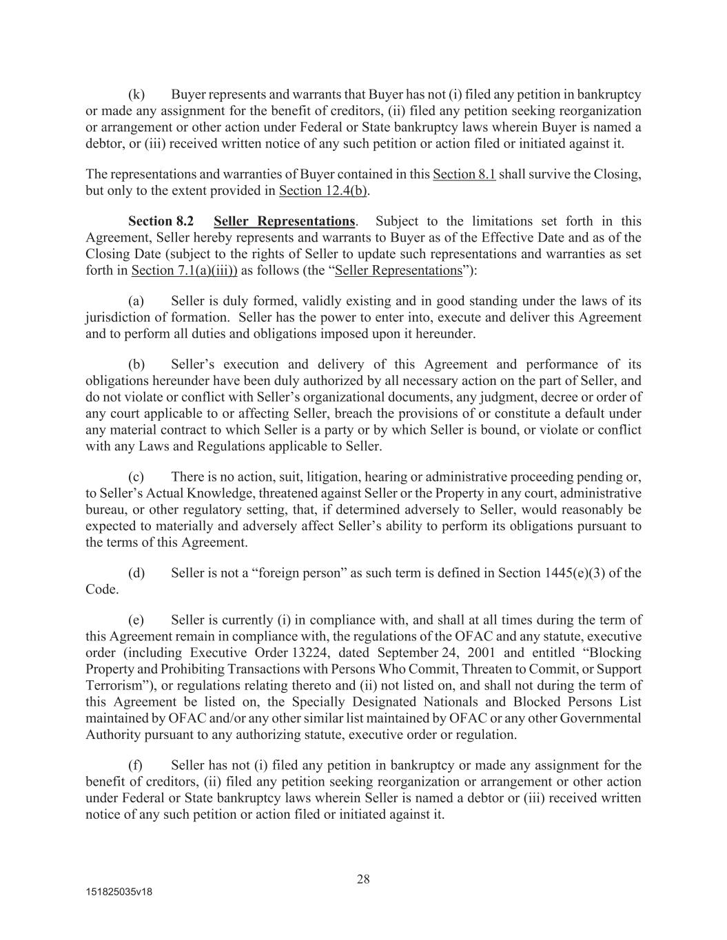 28 151825035v18 (k) Buyer represents and warrants that Buyer has not (i) filed any petition in bankruptcy or made any assignment for the benefit of creditors, (ii) filed any petition seeking reorganization or arrangement or other action under Federal or State bankruptcy laws wherein Buyer is named a debtor, or (iii) received written notice of any such petition or action filed or initiated against it. The representations and warranties of Buyer contained in this Section 8.1 shall survive the Closing, but only to the extent provided in Section 12.4(b). Section 8.2 Seller Representations. Subject to the limitations set forth in this Agreement, Seller hereby represents and warrants to Buyer as of the Effective Date and as of the Closing Date (subject to the rights of Seller to update such representations and warranties as set forth in Section 7.1(a)(iii)) as follows (the “Seller Representations”): (a) Seller is duly formed, validly existing and in good standing under the laws of its jurisdiction of formation. Seller has the power to enter into, execute and deliver this Agreement and to perform all duties and obligations imposed upon it hereunder. (b) Seller’s execution and delivery of this Agreement and performance of its obligations hereunder have been duly authorized by all necessary action on the part of Seller, and do not violate or conflict with Seller’s organizational documents, any judgment, decree or order of any court applicable to or affecting Seller, breach the provisions of or constitute a default under any material contract to which Seller is a party or by which Seller is bound, or violate or conflict with any Laws and Regulations applicable to Seller. (c) There is no action, suit, litigation, hearing or administrative proceeding pending or, to Seller’s Actual Knowledge, threatened against Seller or the Property in any court, administrative bureau, or other regulatory setting, that, if determined adversely to Seller, would reasonably be expected to materially and adversely affect Seller’s ability to perform its obligations pursuant to the terms of this Agreement. (d) Seller is not a “foreign person” as such term is defined in Section 1445(e)(3) of the Code. (e) Seller is currently (i) in compliance with, and shall at all times during the term of this Agreement remain in compliance with, the regulations of the OFAC and any statute, executive order (including Executive Order 13224, dated September 24, 2001 and entitled “Blocking Property and Prohibiting Transactions with Persons Who Commit, Threaten to Commit, or Support Terrorism”), or regulations relating thereto and (ii) not listed on, and shall not during the term of this Agreement be listed on, the Specially Designated Nationals and Blocked Persons List maintained by OFAC and/or any other similar list maintained by OFAC or any other Governmental Authority pursuant to any authorizing statute, executive order or regulation. (f) Seller has not (i) filed any petition in bankruptcy or made any assignment for the benefit of creditors, (ii) filed any petition seeking reorganization or arrangement or other action under Federal or State bankruptcy laws wherein Seller is named a debtor or (iii) received written notice of any such petition or action filed or initiated against it.