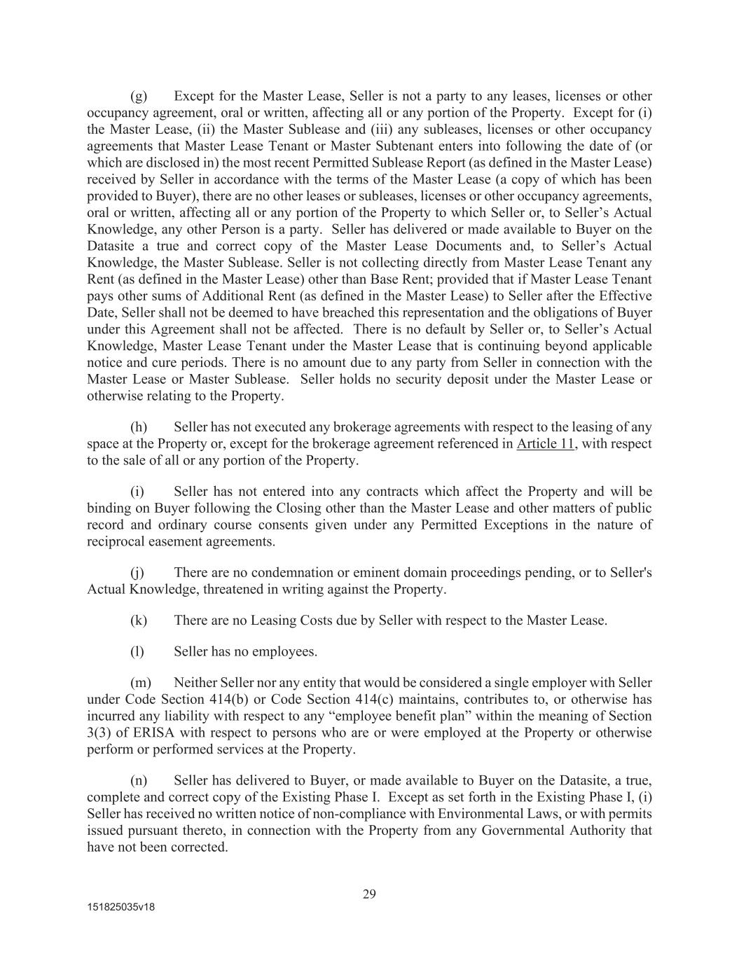 29 151825035v18 (g) Except for the Master Lease, Seller is not a party to any leases, licenses or other occupancy agreement, oral or written, affecting all or any portion of the Property. Except for (i) the Master Lease, (ii) the Master Sublease and (iii) any subleases, licenses or other occupancy agreements that Master Lease Tenant or Master Subtenant enters into following the date of (or which are disclosed in) the most recent Permitted Sublease Report (as defined in the Master Lease) received by Seller in accordance with the terms of the Master Lease (a copy of which has been provided to Buyer), there are no other leases or subleases, licenses or other occupancy agreements, oral or written, affecting all or any portion of the Property to which Seller or, to Seller’s Actual Knowledge, any other Person is a party. Seller has delivered or made available to Buyer on the Datasite a true and correct copy of the Master Lease Documents and, to Seller’s Actual Knowledge, the Master Sublease. Seller is not collecting directly from Master Lease Tenant any Rent (as defined in the Master Lease) other than Base Rent; provided that if Master Lease Tenant pays other sums of Additional Rent (as defined in the Master Lease) to Seller after the Effective Date, Seller shall not be deemed to have breached this representation and the obligations of Buyer under this Agreement shall not be affected. There is no default by Seller or, to Seller’s Actual Knowledge, Master Lease Tenant under the Master Lease that is continuing beyond applicable notice and cure periods. There is no amount due to any party from Seller in connection with the Master Lease or Master Sublease. Seller holds no security deposit under the Master Lease or otherwise relating to the Property. (h) Seller has not executed any brokerage agreements with respect to the leasing of any space at the Property or, except for the brokerage agreement referenced in Article 11, with respect to the sale of all or any portion of the Property. (i) Seller has not entered into any contracts which affect the Property and will be binding on Buyer following the Closing other than the Master Lease and other matters of public record and ordinary course consents given under any Permitted Exceptions in the nature of reciprocal easement agreements. (j) There are no condemnation or eminent domain proceedings pending, or to Seller's Actual Knowledge, threatened in writing against the Property. (k) There are no Leasing Costs due by Seller with respect to the Master Lease. (l) Seller has no employees. (m) Neither Seller nor any entity that would be considered a single employer with Seller under Code Section 414(b) or Code Section 414(c) maintains, contributes to, or otherwise has incurred any liability with respect to any “employee benefit plan” within the meaning of Section 3(3) of ERISA with respect to persons who are or were employed at the Property or otherwise perform or performed services at the Property. (n) Seller has delivered to Buyer, or made available to Buyer on the Datasite, a true, complete and correct copy of the Existing Phase I. Except as set forth in the Existing Phase I, (i) Seller has received no written notice of non-compliance with Environmental Laws, or with permits issued pursuant thereto, in connection with the Property from any Governmental Authority that have not been corrected.