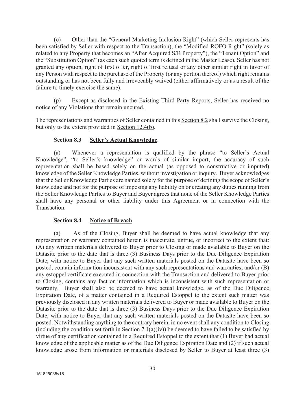 30 151825035v18 (o) Other than the “General Marketing Inclusion Right” (which Seller represents has been satisfied by Seller with respect to the Transaction), the “Modified ROFO Right” (solely as related to any Property that becomes an “After Acquired S/B Property”), the “Tenant Option” and the “Substitution Option” (as each such quoted term is defined in the Master Lease), Seller has not granted any option, right of first offer, right of first refusal or any other similar right in favor of any Person with respect to the purchase of the Property (or any portion thereof) which right remains outstanding or has not been fully and irrevocably waived (either affirmatively or as a result of the failure to timely exercise the same). (p) Except as disclosed in the Existing Third Party Reports, Seller has received no notice of any Violations that remain uncured. The representations and warranties of Seller contained in this Section 8.2 shall survive the Closing, but only to the extent provided in Section 12.4(b). Section 8.3 Seller’s Actual Knowledge. (a) Whenever a representation is qualified by the phrase “to Seller’s Actual Knowledge”, “to Seller’s knowledge” or words of similar import, the accuracy of such representation shall be based solely on the actual (as opposed to constructive or imputed) knowledge of the Seller Knowledge Parties, without investigation or inquiry. Buyer acknowledges that the Seller Knowledge Parties are named solely for the purpose of defining the scope of Seller’s knowledge and not for the purpose of imposing any liability on or creating any duties running from the Seller Knowledge Parties to Buyer and Buyer agrees that none of the Seller Knowledge Parties shall have any personal or other liability under this Agreement or in connection with the Transaction. Section 8.4 Notice of Breach. (a) As of the Closing, Buyer shall be deemed to have actual knowledge that any representation or warranty contained herein is inaccurate, untrue, or incorrect to the extent that: (A) any written materials delivered to Buyer prior to Closing or made available to Buyer on the Datasite prior to the date that is three (3) Business Days prior to the Due Diligence Expiration Date, with notice to Buyer that any such written materials posted on the Datasite have been so posted, contain information inconsistent with any such representations and warranties; and/or (B) any estoppel certificate executed in connection with the Transaction and delivered to Buyer prior to Closing, contains any fact or information which is inconsistent with such representation or warranty. Buyer shall also be deemed to have actual knowledge, as of the Due Diligence Expiration Date, of a matter contained in a Required Estoppel to the extent such matter was previously disclosed in any written materials delivered to Buyer or made available to Buyer on the Datasite prior to the date that is three (3) Business Days prior to the Due Diligence Expiration Date, with notice to Buyer that any such written materials posted on the Datasite have been so posted. Notwithstanding anything to the contrary herein, in no event shall any condition to Closing (including the condition set forth in Section 7.1(a)(iv)) be deemed to have failed to be satisfied by virtue of any certification contained in a Required Estoppel to the extent that (1) Buyer had actual knowledge of the applicable matter as of the Due Diligence Expiration Date and (2) if such actual knowledge arose from information or materials disclosed by Seller to Buyer at least three (3)