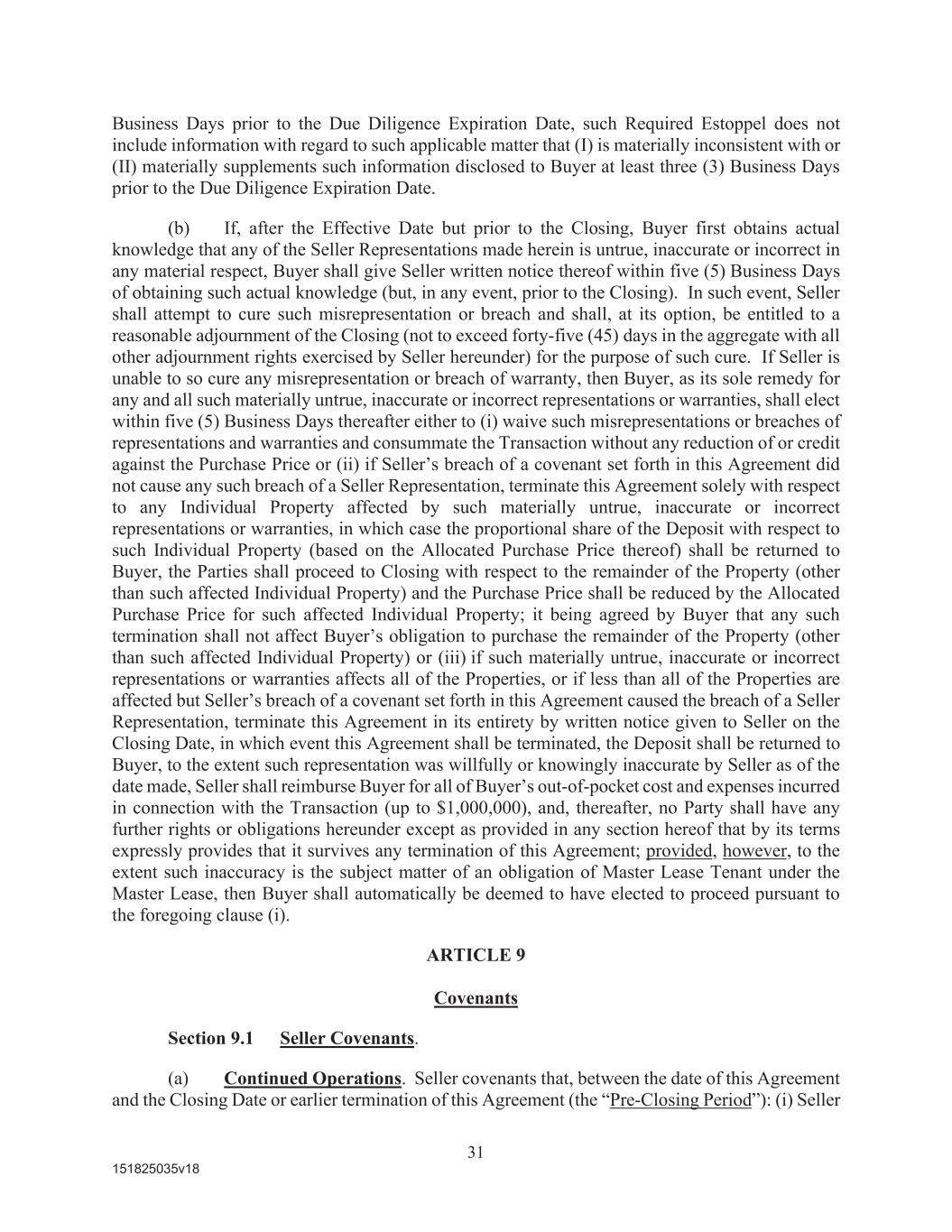 31 151825035v18 Business Days prior to the Due Diligence Expiration Date, such Required Estoppel does not include information with regard to such applicable matter that (I) is materially inconsistent with or (II) materially supplements such information disclosed to Buyer at least three (3) Business Days prior to the Due Diligence Expiration Date. (b) If, after the Effective Date but prior to the Closing, Buyer first obtains actual knowledge that any of the Seller Representations made herein is untrue, inaccurate or incorrect in any material respect, Buyer shall give Seller written notice thereof within five (5) Business Days of obtaining such actual knowledge (but, in any event, prior to the Closing). In such event, Seller shall attempt to cure such misrepresentation or breach and shall, at its option, be entitled to a reasonable adjournment of the Closing (not to exceed forty-five (45) days in the aggregate with all other adjournment rights exercised by Seller hereunder) for the purpose of such cure. If Seller is unable to so cure any misrepresentation or breach of warranty, then Buyer, as its sole remedy for any and all such materially untrue, inaccurate or incorrect representations or warranties, shall elect within five (5) Business Days thereafter either to (i) waive such misrepresentations or breaches of representations and warranties and consummate the Transaction without any reduction of or credit against the Purchase Price or (ii) if Seller’s breach of a covenant set forth in this Agreement did not cause any such breach of a Seller Representation, terminate this Agreement solely with respect to any Individual Property affected by such materially untrue, inaccurate or incorrect representations or warranties, in which case the proportional share of the Deposit with respect to such Individual Property (based on the Allocated Purchase Price thereof) shall be returned to Buyer, the Parties shall proceed to Closing with respect to the remainder of the Property (other than such affected Individual Property) and the Purchase Price shall be reduced by the Allocated Purchase Price for such affected Individual Property; it being agreed by Buyer that any such termination shall not affect Buyer’s obligation to purchase the remainder of the Property (other than such affected Individual Property) or (iii) if such materially untrue, inaccurate or incorrect representations or warranties affects all of the Properties, or if less than all of the Properties are affected but Seller’s breach of a covenant set forth in this Agreement caused the breach of a Seller Representation, terminate this Agreement in its entirety by written notice given to Seller on the Closing Date, in which event this Agreement shall be terminated, the Deposit shall be returned to Buyer, to the extent such representation was willfully or knowingly inaccurate by Seller as of the date made, Seller shall reimburse Buyer for all of Buyer’s out-of-pocket cost and expenses incurred in connection with the Transaction (up to $1,000,000), and, thereafter, no Party shall have any further rights or obligations hereunder except as provided in any section hereof that by its terms expressly provides that it survives any termination of this Agreement; provided, however, to the extent such inaccuracy is the subject matter of an obligation of Master Lease Tenant under the Master Lease, then Buyer shall automatically be deemed to have elected to proceed pursuant to the foregoing clause (i). ARTICLE 9 Covenants Section 9.1 Seller Covenants. (a) Continued Operations. Seller covenants that, between the date of this Agreement and the Closing Date or earlier termination of this Agreement (the “Pre-Closing Period”): (i) Seller