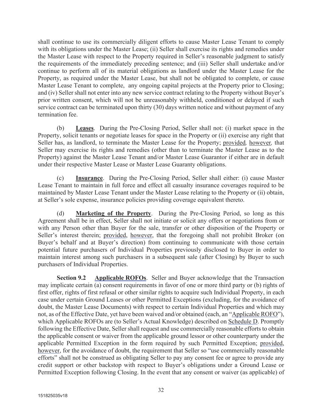 32 151825035v18 shall continue to use its commercially diligent efforts to cause Master Lease Tenant to comply with its obligations under the Master Lease; (ii) Seller shall exercise its rights and remedies under the Master Lease with respect to the Property required in Seller’s reasonable judgment to satisfy the requirements of the immediately preceding sentence; and (iii) Seller shall undertake and/or continue to perform all of its material obligations as landlord under the Master Lease for the Property, as required under the Master Lease, but shall not be obligated to complete, or cause Master Lease Tenant to complete, any ongoing capital projects at the Property prior to Closing; and (iv) Seller shall not enter into any new service contract relating to the Property without Buyer’s prior written consent, which will not be unreasonably withheld, conditioned or delayed if such service contract can be terminated upon thirty (30) days written notice and without payment of any termination fee. (b) Leases. During the Pre-Closing Period, Seller shall not: (i) market space in the Property, solicit tenants or negotiate leases for space in the Property or (ii) exercise any right that Seller has, as landlord, to terminate the Master Lease for the Property; provided, however, that Seller may exercise its rights and remedies (other than to terminate the Master Lease as to the Property) against the Master Lease Tenant and/or Master Lease Guarantor if either are in default under their respective Master Lease or Master Lease Guaranty obligations. (c) Insurance. During the Pre-Closing Period, Seller shall either: (i) cause Master Lease Tenant to maintain in full force and effect all casualty insurance coverages required to be maintained by Master Lease Tenant under the Master Lease relating to the Property or (ii) obtain, at Seller’s sole expense, insurance policies providing coverage equivalent thereto. (d) Marketing of the Property. During the Pre-Closing Period, so long as this Agreement shall be in effect, Seller shall not initiate or solicit any offers or negotiations from or with any Person other than Buyer for the sale, transfer or other disposition of the Property or Seller’s interest therein; provided, however, that the foregoing shall not prohibit Broker (on Buyer’s behalf and at Buyer’s direction) from continuing to communicate with those certain potential future purchasers of Individual Properties previously disclosed to Buyer in order to maintain interest among such purchasers in a subsequent sale (after Closing) by Buyer to such purchasers of Individual Properties. Section 9.2 Applicable ROFOs. Seller and Buyer acknowledge that the Transaction may implicate certain (a) consent requirements in favor of one or more third party or (b) rights of first offer, rights of first refusal or other similar rights to acquire such Individual Property, in each case under certain Ground Leases or other Permitted Exceptions (excluding, for the avoidance of doubt, the Master Lease Documents) with respect to certain Individual Properties and which may not, as of the Effective Date, yet have been waived and/or obtained (each, an “Applicable ROFO”), which Applicable ROFOs are (to Seller’s Actual Knowledge) described on Schedule D. Promptly following the Effective Date, Seller shall request and use commercially reasonable efforts to obtain the applicable consent or waiver from the applicable ground lessor or other counterparty under the applicable Permitted Exception in the form required by such Permitted Exception; provided, however, for the avoidance of doubt, the requirement that Seller so “use commercially reasonable efforts” shall not be construed as obligating Seller to pay any consent fee or agree to provide any credit support or other backstop with respect to Buyer’s obligations under a Ground Lease or Permitted Exception following Closing. In the event that any consent or waiver (as applicable) of