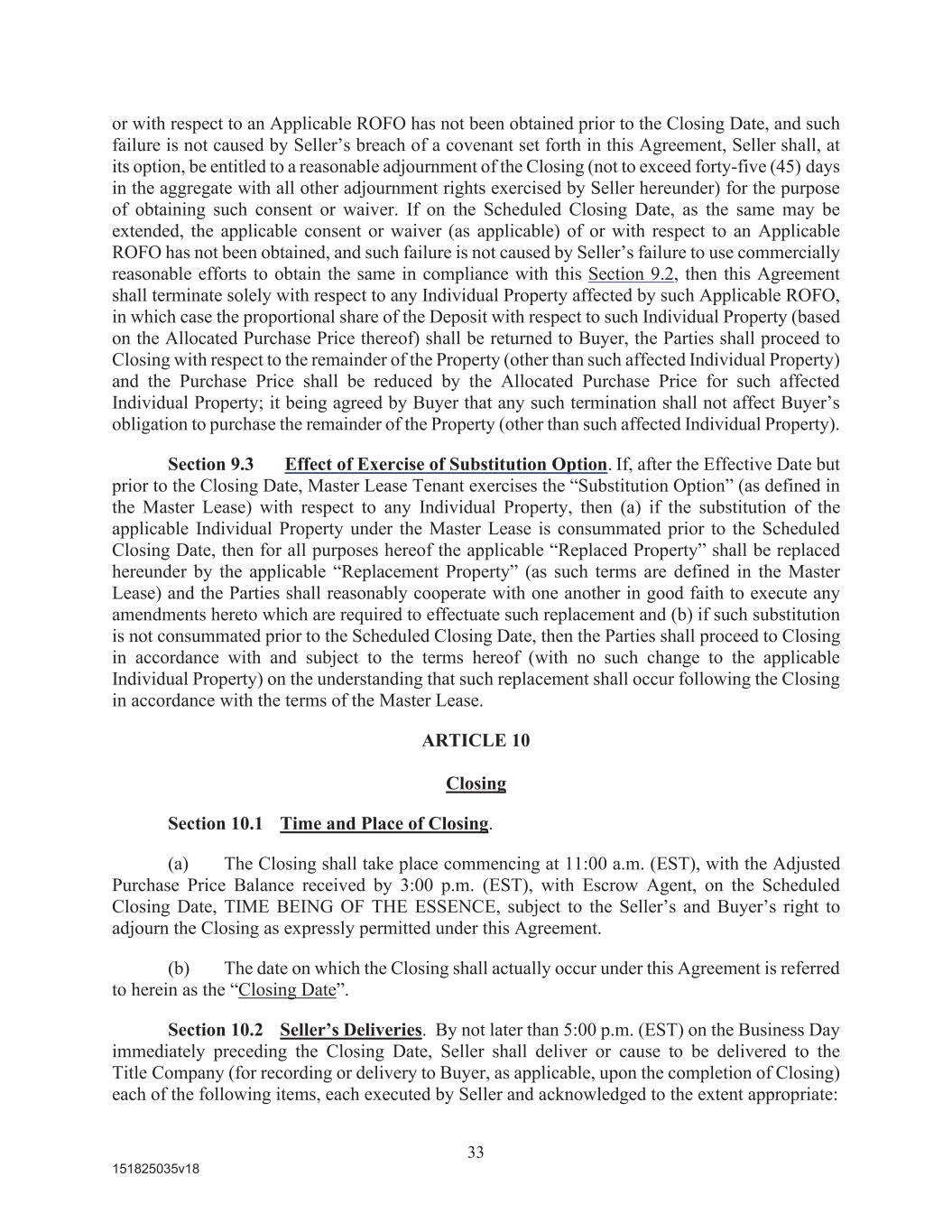33 151825035v18 or with respect to an Applicable ROFO has not been obtained prior to the Closing Date, and such failure is not caused by Seller’s breach of a covenant set forth in this Agreement, Seller shall, at its option, be entitled to a reasonable adjournment of the Closing (not to exceed forty-five (45) days in the aggregate with all other adjournment rights exercised by Seller hereunder) for the purpose of obtaining such consent or waiver. If on the Scheduled Closing Date, as the same may be extended, the applicable consent or waiver (as applicable) of or with respect to an Applicable ROFO has not been obtained, and such failure is not caused by Seller’s failure to use commercially reasonable efforts to obtain the same in compliance with this Section 9.2, then this Agreement shall terminate solely with respect to any Individual Property affected by such Applicable ROFO, in which case the proportional share of the Deposit with respect to such Individual Property (based on the Allocated Purchase Price thereof) shall be returned to Buyer, the Parties shall proceed to Closing with respect to the remainder of the Property (other than such affected Individual Property) and the Purchase Price shall be reduced by the Allocated Purchase Price for such affected Individual Property; it being agreed by Buyer that any such termination shall not affect Buyer’s obligation to purchase the remainder of the Property (other than such affected Individual Property). Section 9.3 Effect of Exercise of Substitution Option. If, after the Effective Date but prior to the Closing Date, Master Lease Tenant exercises the “Substitution Option” (as defined in the Master Lease) with respect to any Individual Property, then (a) if the substitution of the applicable Individual Property under the Master Lease is consummated prior to the Scheduled Closing Date, then for all purposes hereof the applicable “Replaced Property” shall be replaced hereunder by the applicable “Replacement Property” (as such terms are defined in the Master Lease) and the Parties shall reasonably cooperate with one another in good faith to execute any amendments hereto which are required to effectuate such replacement and (b) if such substitution is not consummated prior to the Scheduled Closing Date, then the Parties shall proceed to Closing in accordance with and subject to the terms hereof (with no such change to the applicable Individual Property) on the understanding that such replacement shall occur following the Closing in accordance with the terms of the Master Lease. ARTICLE 10 Closing Section 10.1 Time and Place of Closing. (a) The Closing shall take place commencing at 11:00 a.m. (EST), with the Adjusted Purchase Price Balance received by 3:00 p.m. (EST), with Escrow Agent, on the Scheduled Closing Date, TIME BEING OF THE ESSENCE, subject to the Seller’s and Buyer’s right to adjourn the Closing as expressly permitted under this Agreement. (b) The date on which the Closing shall actually occur under this Agreement is referred to herein as the “Closing Date”. Section 10.2 Seller’s Deliveries. By not later than 5:00 p.m. (EST) on the Business Day immediately preceding the Closing Date, Seller shall deliver or cause to be delivered to the Title Company (for recording or delivery to Buyer, as applicable, upon the completion of Closing) each of the following items, each executed by Seller and acknowledged to the extent appropriate: