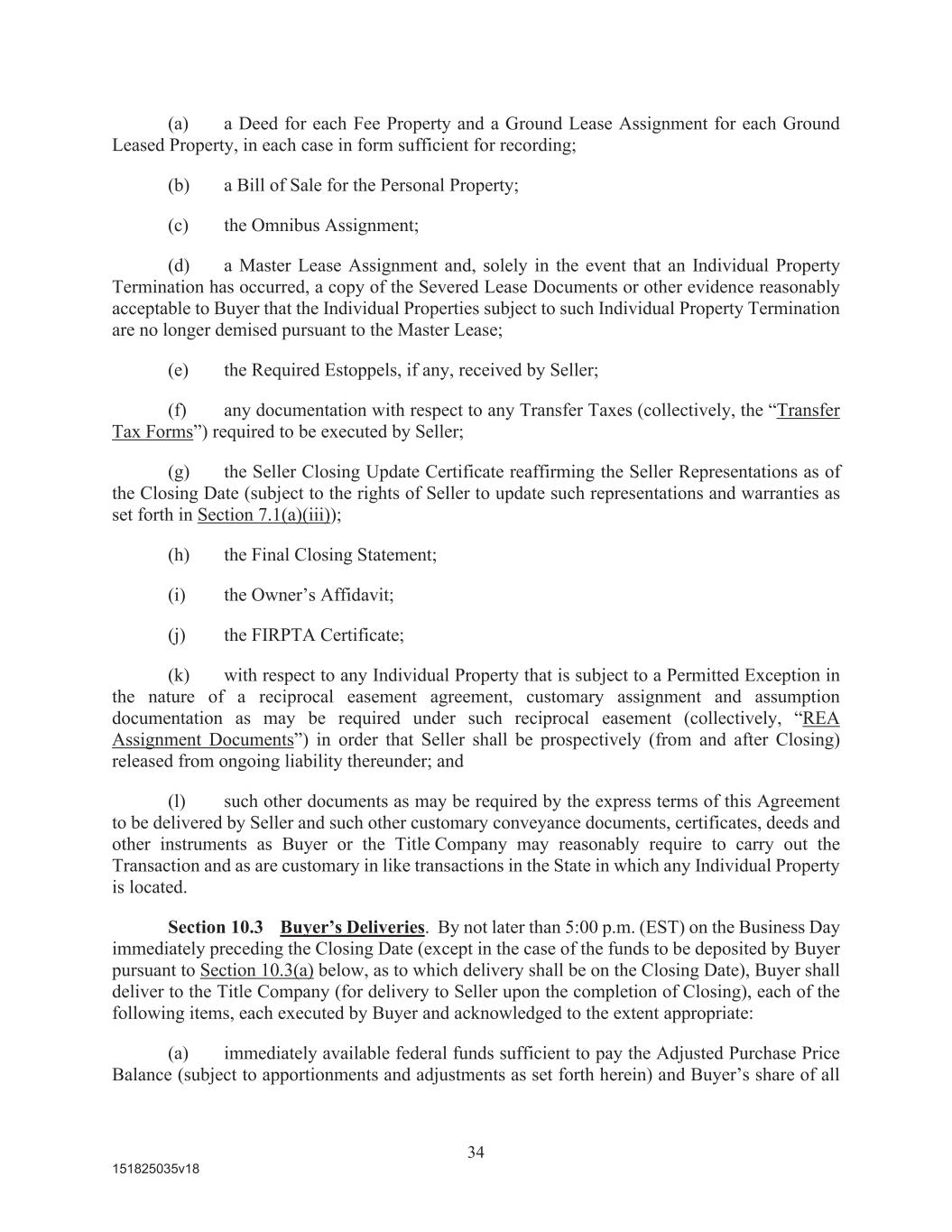 34 151825035v18 (a) a Deed for each Fee Property and a Ground Lease Assignment for each Ground Leased Property, in each case in form sufficient for recording; (b) a Bill of Sale for the Personal Property; (c) the Omnibus Assignment; (d) a Master Lease Assignment and, solely in the event that an Individual Property Termination has occurred, a copy of the Severed Lease Documents or other evidence reasonably acceptable to Buyer that the Individual Properties subject to such Individual Property Termination are no longer demised pursuant to the Master Lease; (e) the Required Estoppels, if any, received by Seller; (f) any documentation with respect to any Transfer Taxes (collectively, the “Transfer Tax Forms”) required to be executed by Seller; (g) the Seller Closing Update Certificate reaffirming the Seller Representations as of the Closing Date (subject to the rights of Seller to update such representations and warranties as set forth in Section 7.1(a)(iii)); (h) the Final Closing Statement; (i) the Owner’s Affidavit; (j) the FIRPTA Certificate; (k) with respect to any Individual Property that is subject to a Permitted Exception in the nature of a reciprocal easement agreement, customary assignment and assumption documentation as may be required under such reciprocal easement (collectively, “REA Assignment Documents”) in order that Seller shall be prospectively (from and after Closing) released from ongoing liability thereunder; and (l) such other documents as may be required by the express terms of this Agreement to be delivered by Seller and such other customary conveyance documents, certificates, deeds and other instruments as Buyer or the Title Company may reasonably require to carry out the Transaction and as are customary in like transactions in the State in which any Individual Property is located. Section 10.3 Buyer’s Deliveries. By not later than 5:00 p.m. (EST) on the Business Day immediately preceding the Closing Date (except in the case of the funds to be deposited by Buyer pursuant to Section 10.3(a) below, as to which delivery shall be on the Closing Date), Buyer shall deliver to the Title Company (for delivery to Seller upon the completion of Closing), each of the following items, each executed by Buyer and acknowledged to the extent appropriate: (a) immediately available federal funds sufficient to pay the Adjusted Purchase Price Balance (subject to apportionments and adjustments as set forth herein) and Buyer’s share of all