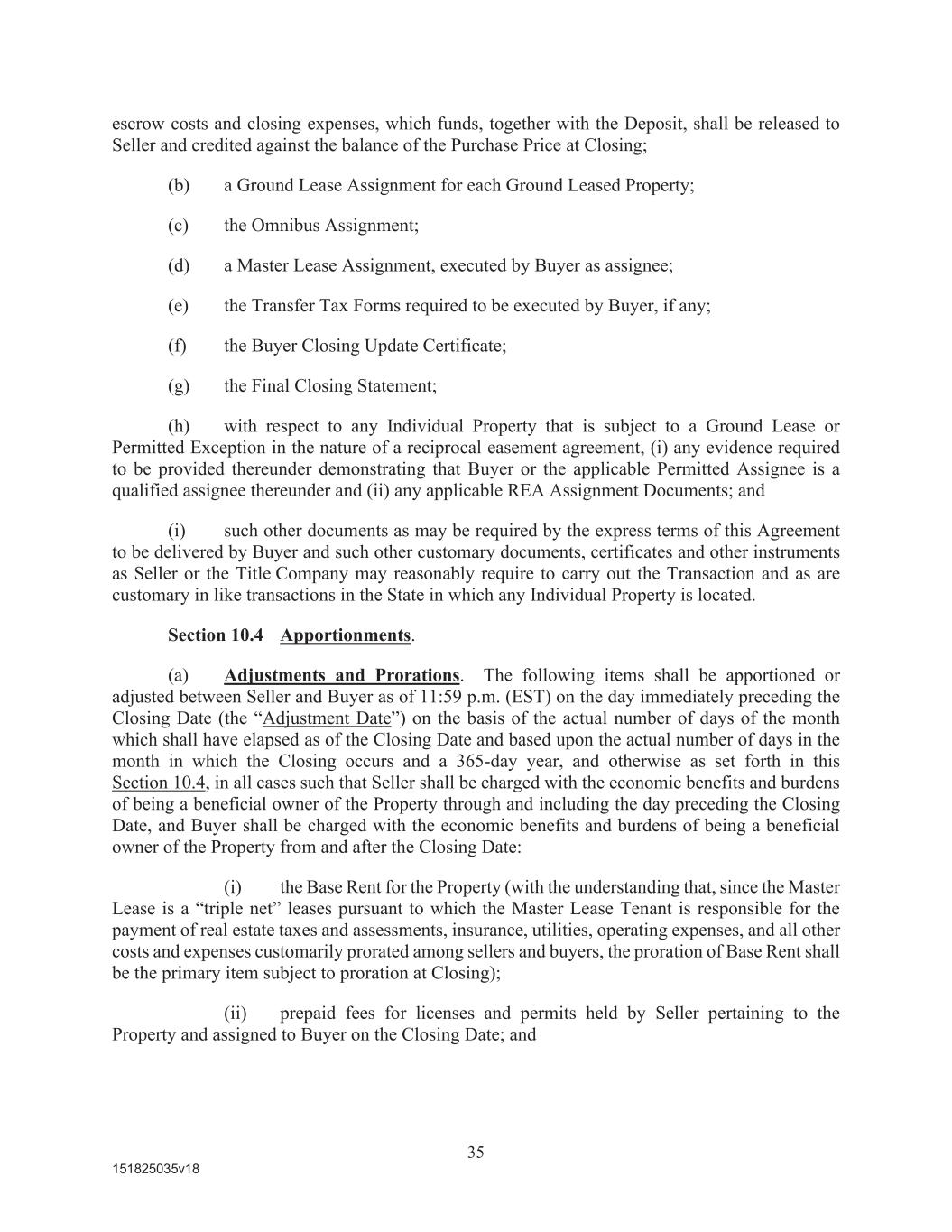 35 151825035v18 escrow costs and closing expenses, which funds, together with the Deposit, shall be released to Seller and credited against the balance of the Purchase Price at Closing; (b) a Ground Lease Assignment for each Ground Leased Property; (c) the Omnibus Assignment; (d) a Master Lease Assignment, executed by Buyer as assignee; (e) the Transfer Tax Forms required to be executed by Buyer, if any; (f) the Buyer Closing Update Certificate; (g) the Final Closing Statement; (h) with respect to any Individual Property that is subject to a Ground Lease or Permitted Exception in the nature of a reciprocal easement agreement, (i) any evidence required to be provided thereunder demonstrating that Buyer or the applicable Permitted Assignee is a qualified assignee thereunder and (ii) any applicable REA Assignment Documents; and (i) such other documents as may be required by the express terms of this Agreement to be delivered by Buyer and such other customary documents, certificates and other instruments as Seller or the Title Company may reasonably require to carry out the Transaction and as are customary in like transactions in the State in which any Individual Property is located. Section 10.4 Apportionments. (a) Adjustments and Prorations. The following items shall be apportioned or adjusted between Seller and Buyer as of 11:59 p.m. (EST) on the day immediately preceding the Closing Date (the “Adjustment Date”) on the basis of the actual number of days of the month which shall have elapsed as of the Closing Date and based upon the actual number of days in the month in which the Closing occurs and a 365-day year, and otherwise as set forth in this Section 10.4, in all cases such that Seller shall be charged with the economic benefits and burdens of being a beneficial owner of the Property through and including the day preceding the Closing Date, and Buyer shall be charged with the economic benefits and burdens of being a beneficial owner of the Property from and after the Closing Date: (i) the Base Rent for the Property (with the understanding that, since the Master Lease is a “triple net” leases pursuant to which the Master Lease Tenant is responsible for the payment of real estate taxes and assessments, insurance, utilities, operating expenses, and all other costs and expenses customarily prorated among sellers and buyers, the proration of Base Rent shall be the primary item subject to proration at Closing); (ii) prepaid fees for licenses and permits held by Seller pertaining to the Property and assigned to Buyer on the Closing Date; and
