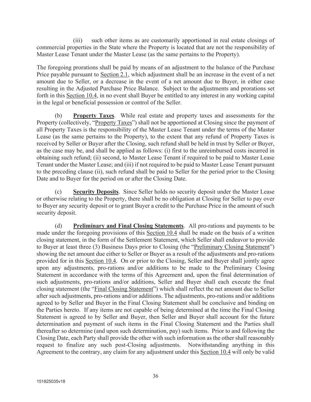 36 151825035v18 (iii) such other items as are customarily apportioned in real estate closings of commercial properties in the State where the Property is located that are not the responsibility of Master Lease Tenant under the Master Lease (as the same pertains to the Property). The foregoing prorations shall be paid by means of an adjustment to the balance of the Purchase Price payable pursuant to Section 2.1, which adjustment shall be an increase in the event of a net amount due to Seller, or a decrease in the event of a net amount due to Buyer, in either case resulting in the Adjusted Purchase Price Balance. Subject to the adjustments and prorations set forth in this Section 10.4, in no event shall Buyer be entitled to any interest in any working capital in the legal or beneficial possession or control of the Seller. (b) Property Taxes. While real estate and property taxes and assessments for the Property (collectively, “Property Taxes”) shall not be apportioned at Closing since the payment of all Property Taxes is the responsibility of the Master Lease Tenant under the terms of the Master Lease (as the same pertains to the Property), to the extent that any refund of Property Taxes is received by Seller or Buyer after the Closing, such refund shall be held in trust by Seller or Buyer, as the case may be, and shall be applied as follows: (i) first to the unreimbursed costs incurred in obtaining such refund; (ii) second, to Master Lease Tenant if required to be paid to Master Lease Tenant under the Master Lease; and (iii) if not required to be paid to Master Lease Tenant pursuant to the preceding clause (ii), such refund shall be paid to Seller for the period prior to the Closing Date and to Buyer for the period on or after the Closing Date. (c) Security Deposits. Since Seller holds no security deposit under the Master Lease or otherwise relating to the Property, there shall be no obligation at Closing for Seller to pay over to Buyer any security deposit or to grant Buyer a credit to the Purchase Price in the amount of such security deposit. (d) Preliminary and Final Closing Statements. All pro-rations and payments to be made under the foregoing provisions of this Section 10.4 shall be made on the basis of a written closing statement, in the form of the Settlement Statement, which Seller shall endeavor to provide to Buyer at least three (3) Business Days prior to Closing (the “Preliminary Closing Statement”) showing the net amount due either to Seller or Buyer as a result of the adjustments and pro-rations provided for in this Section 10.4. On or prior to the Closing, Seller and Buyer shall jointly agree upon any adjustments, pro-rations and/or additions to be made to the Preliminary Closing Statement in accordance with the terms of this Agreement and, upon the final determination of such adjustments, pro-rations and/or additions, Seller and Buyer shall each execute the final closing statement (the “Final Closing Statement”) which shall reflect the net amount due to Seller after such adjustments, pro-rations and/or additions. The adjustments, pro-rations and/or additions agreed to by Seller and Buyer in the Final Closing Statement shall be conclusive and binding on the Parties hereto. If any items are not capable of being determined at the time the Final Closing Statement is agreed to by Seller and Buyer, then Seller and Buyer shall account for the future determination and payment of such items in the Final Closing Statement and the Parties shall thereafter so determine (and upon such determination, pay) such items. Prior to and following the Closing Date, each Party shall provide the other with such information as the other shall reasonably request to finalize any such post-Closing adjustments. Notwithstanding anything in this Agreement to the contrary, any claim for any adjustment under this Section 10.4 will only be valid